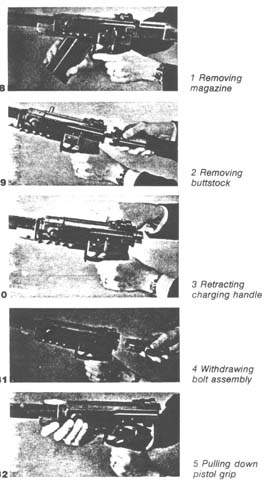 推起位于机匣下面、握把后方的卡笋,将枪托反时针转动90°,自后方取下枪托;