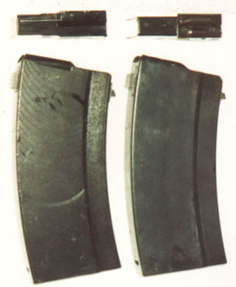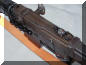 如所示,机匣是用1.5mm厚的薄钢板冲压而成,两端各插入一个钢颈环,并用铜焊固定,分别作为枪管节套环和固定枪托的连接部。机匣前后两部分的强度都比较高,后部装枪托和复进簧,前部容纳枪机和滚柱座。滚柱座是用螺纹固定的,这样,当它磨损时(用塞规插入闭锁状态的机头和机体之间进行测量),即可拧下予以更换。