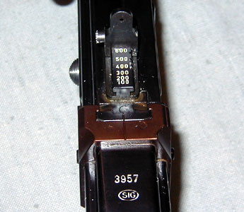 表尺装在表尺框上,有一大的觇孔照门。表尺上有压扣,借助于该压扣,表尺框能在表尺座中上、下移动,以调整射程装定。射程装定从100米至640米,其中100~200米处以50米为一个增量,从200~300米处以30米为一个增量,从300~640米处以20米为一个增量。