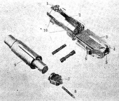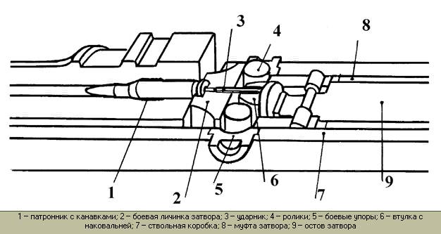 闭锁状态的枪机:1-弹膛,2-机头,3-击针,4-闭锁滚柱,5-机匣闭锁槽插件,6-楔铁,7-机匣,8-机体套筒,9-机体。