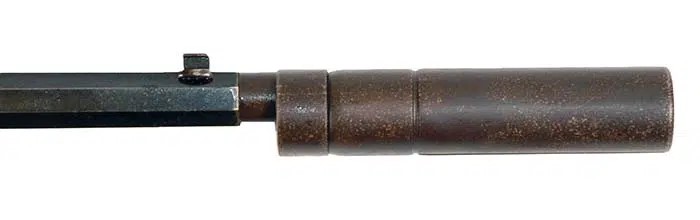 ![]() 最早的马克沁消声器安装方式:由于大部分的步枪枪管本身是没有安装螺纹,因此需要先在枪口安装一个螺丝连接器。图中所示的连接器上就是采用了断续螺纹 |