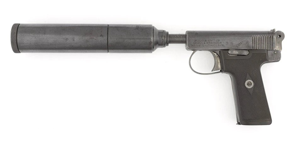 安装在韦伯利M1908手枪上的马克沁M1929型消声器,这是同心安装方式