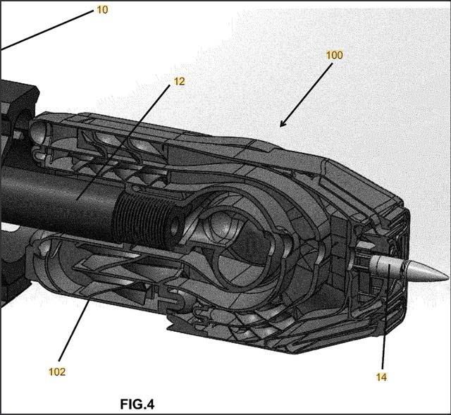 MFMD内部结构,可以看出气体流道比起传统消声器要复杂得多,图中也可以看出MFMD不是快拆结构,安装前必须先拆卸枪上的消焰器或制退器