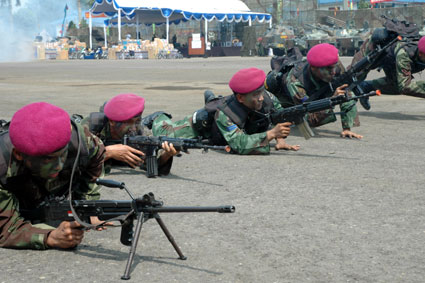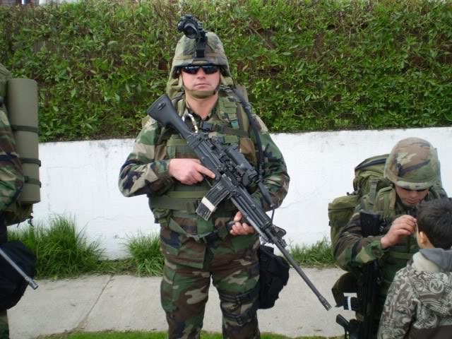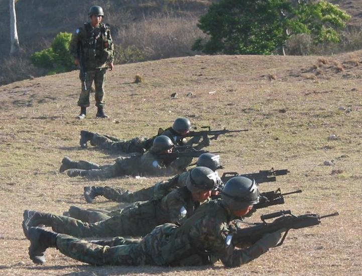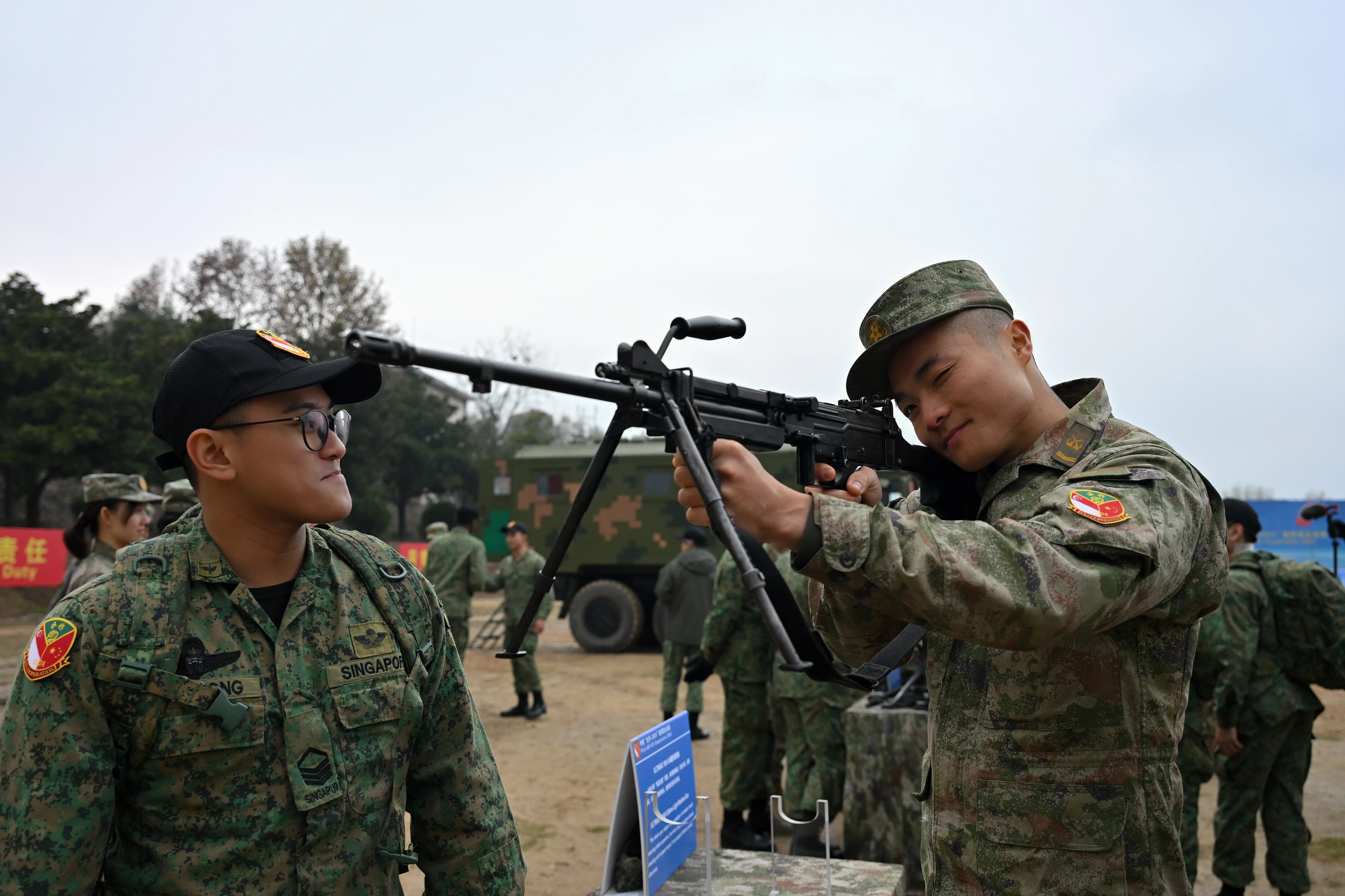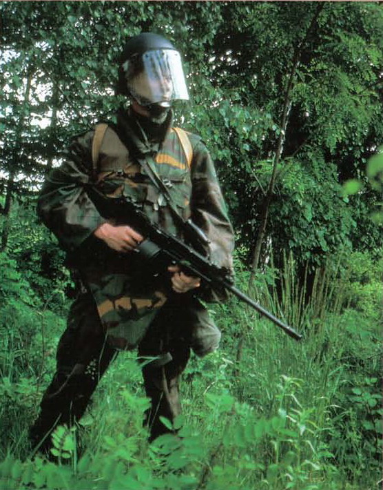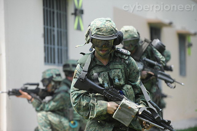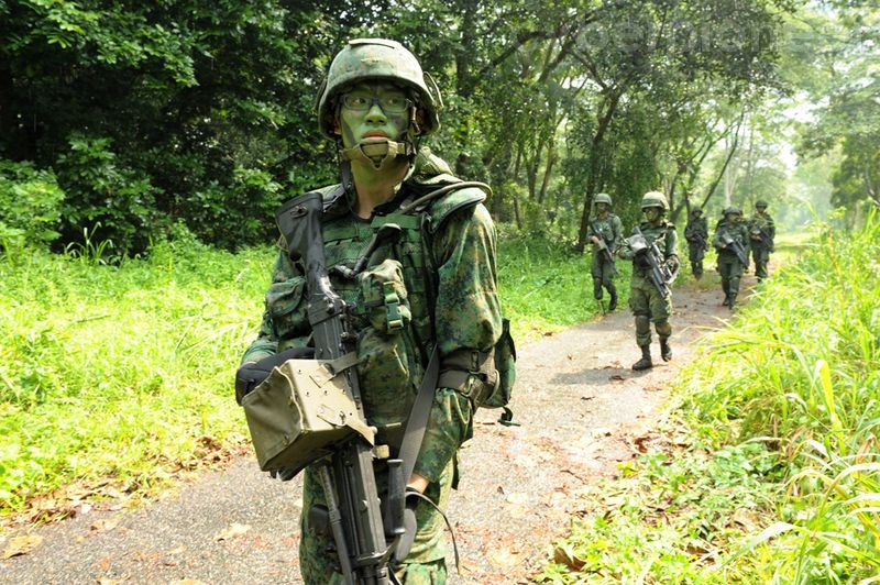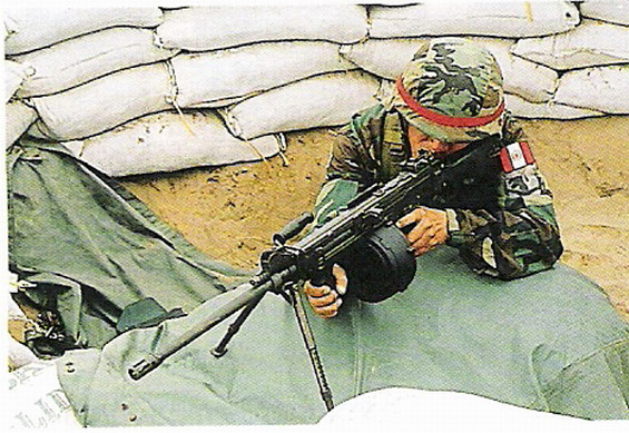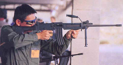 装备Ultimax 100式MK3型轻机枪的新加坡陆军,图中左边的士兵使用的是M16S1,是由CIS公司生产的M16A1。