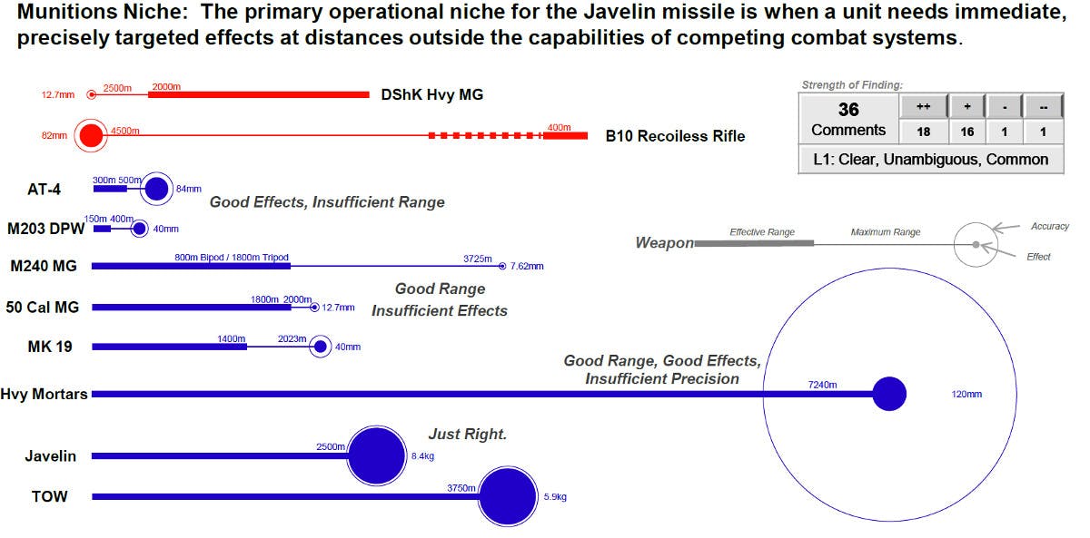 2011年影响美军决定扩大装备MAAWS的研究报告中的敌我双方轻武器作战效果示意图,标枪是最理想的反击武器
