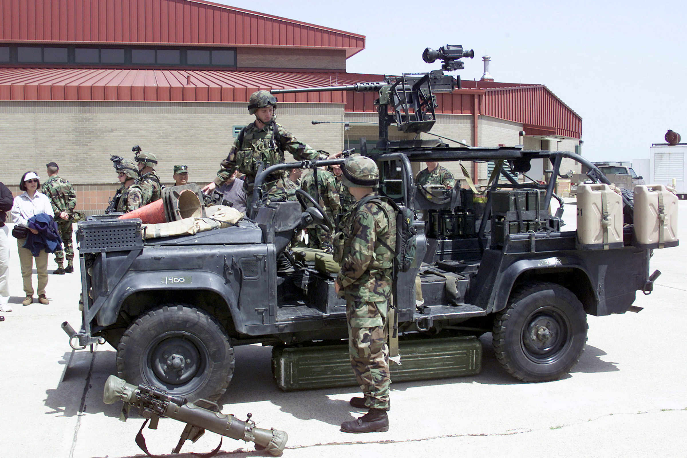游骑兵团在公众开放日上展示“路虎防御者”改装的攻击车RSOV(Ranger Special Operations Vehicle)及搭载的武器装备,每一辆车可配备一具RAAWS