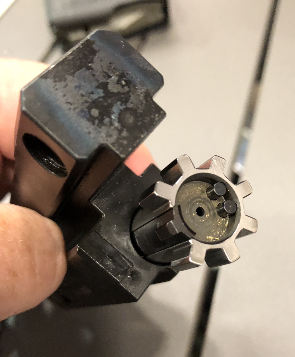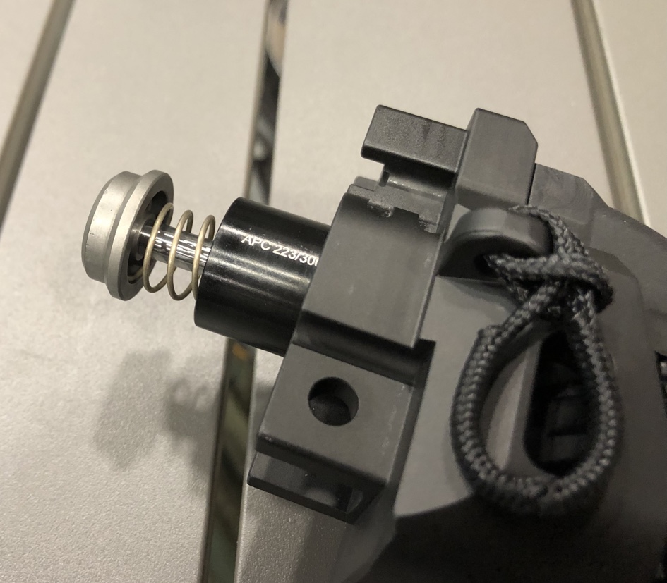 与手枪弹口径的APC9不一样,APC556/300/308等步枪弹口径的卡宾枪是采用导气式原理,在枪管上方有一组短冲程导气活塞,导气装置前端有手动的气体调节器,配合消声器或恶劣环境下来不及维护导气系统时使用。枪机为多闭锁凸耳的回转式枪机,与冲锋枪型一样在机匣尾端有后坐缓冲器。