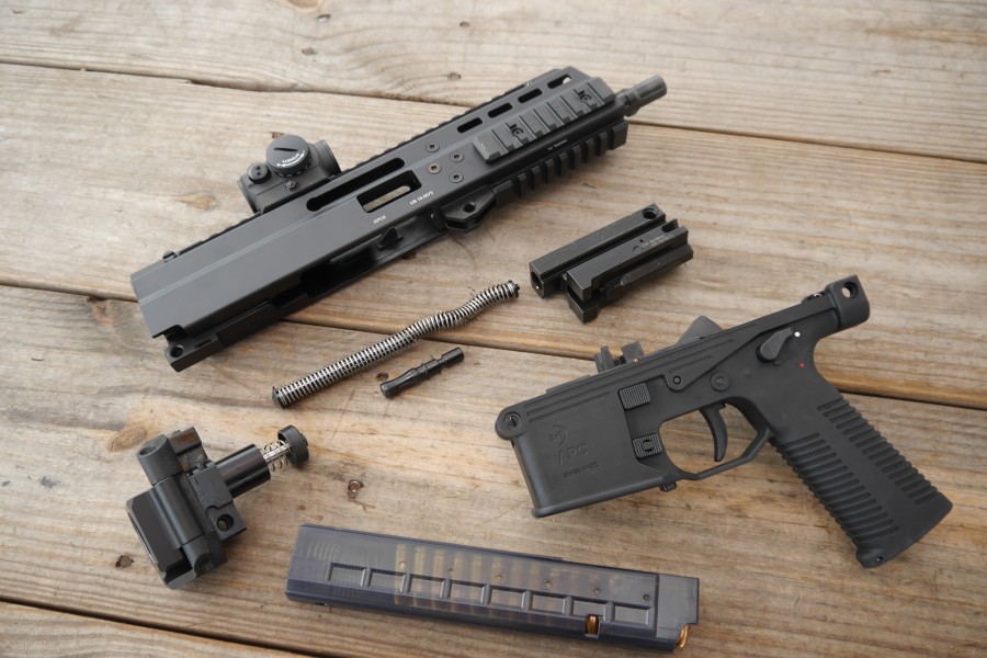 分解后的APC9半自动手枪型,与冲锋枪型的区别是枪托及击发机构