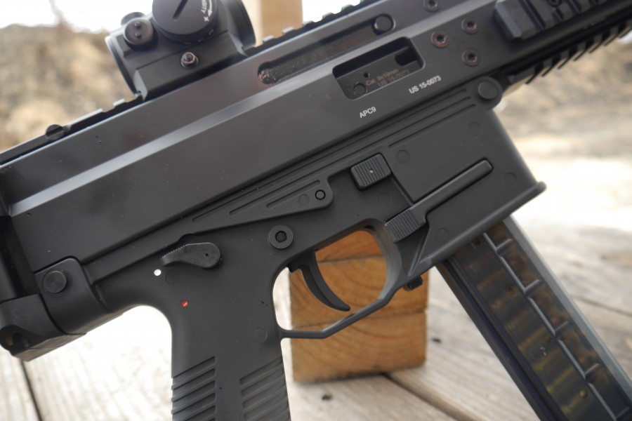 APC9冲锋枪在下机匣两侧都有操纵装置,因此无论射手是惯用右手还是左手都能轻松操纵。握把上方左右两侧都有手动保险/快慢机旋柄,可用拇指拨动操作,有保险、半自动、全自动三档。弹匣释放按钮位于扳机护圈前方,空仓挂机的解脱按钮则位于弹匣释放按钮的上方,也是左右两侧皆有。但有使用者认为它的快慢机旋柄尺寸有点小,在匆忙中不易操作。另外,其空仓挂机释放按钮与弹匣释放钮靠得很近,而且都是按压式操作,一不小心就会操作失误。但在2019年推出的APC9 Pro系列上,空仓挂机按钮改为向下压,操作方式改变后就不容易误操作了,估计是根据用户投诉而作出的改进。