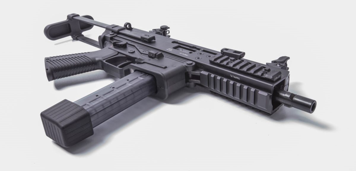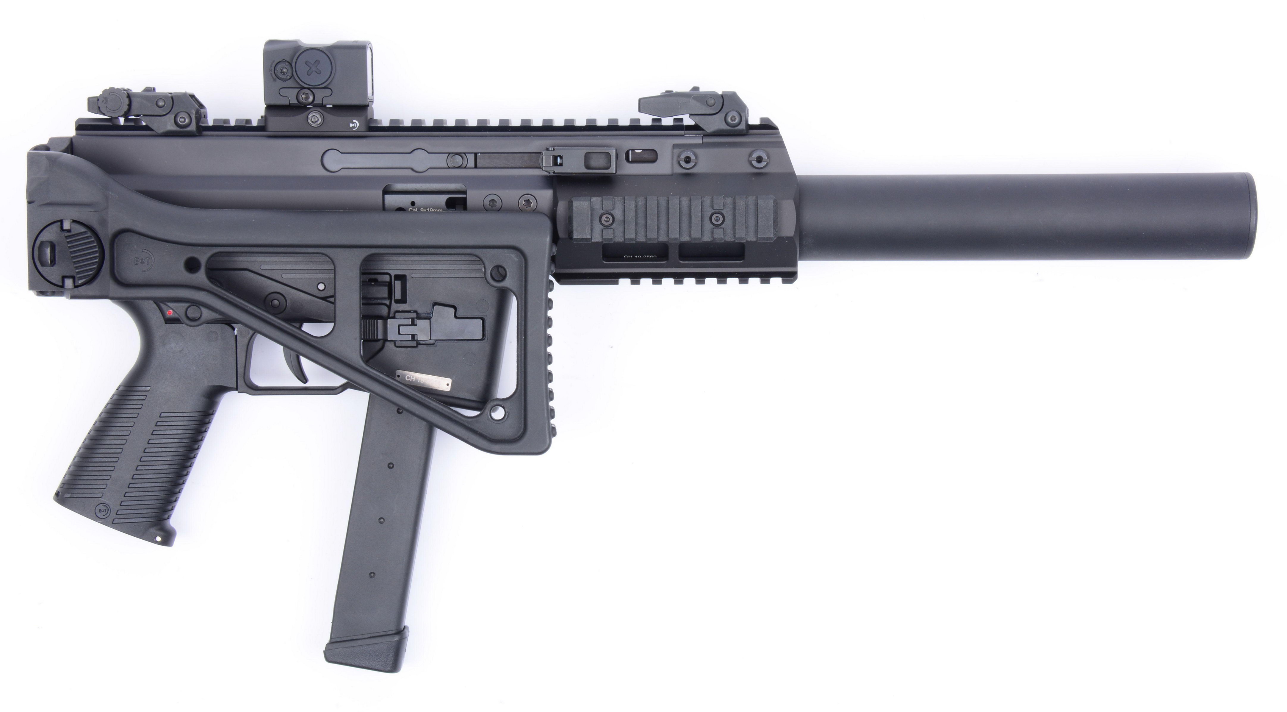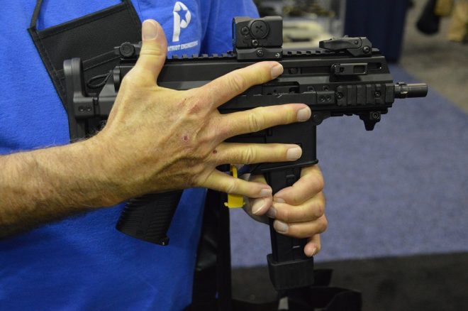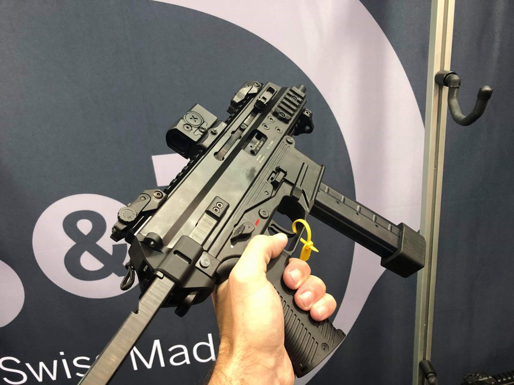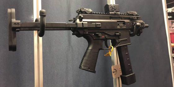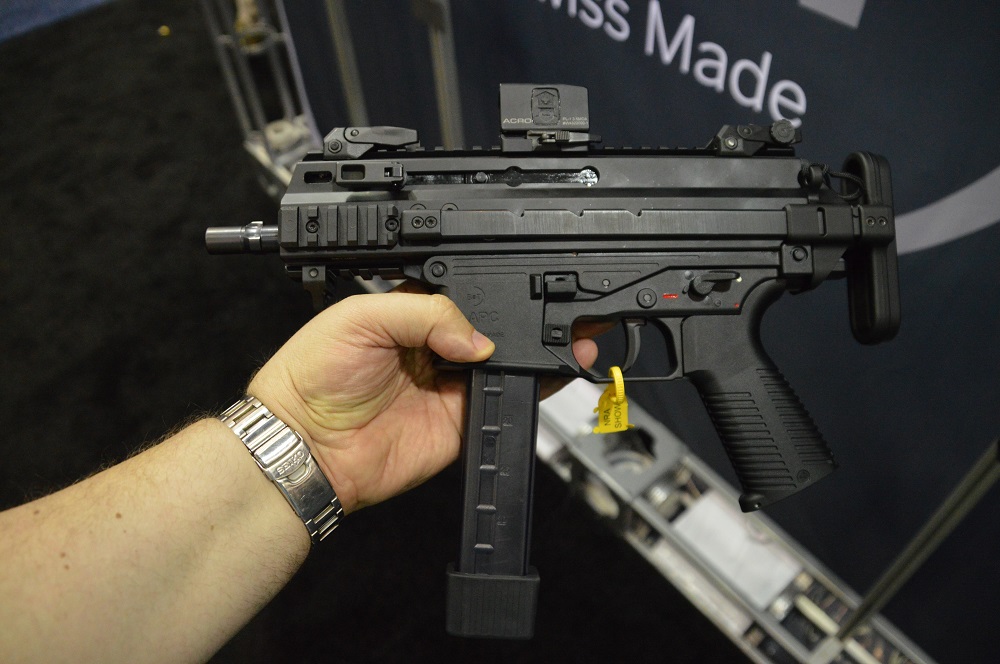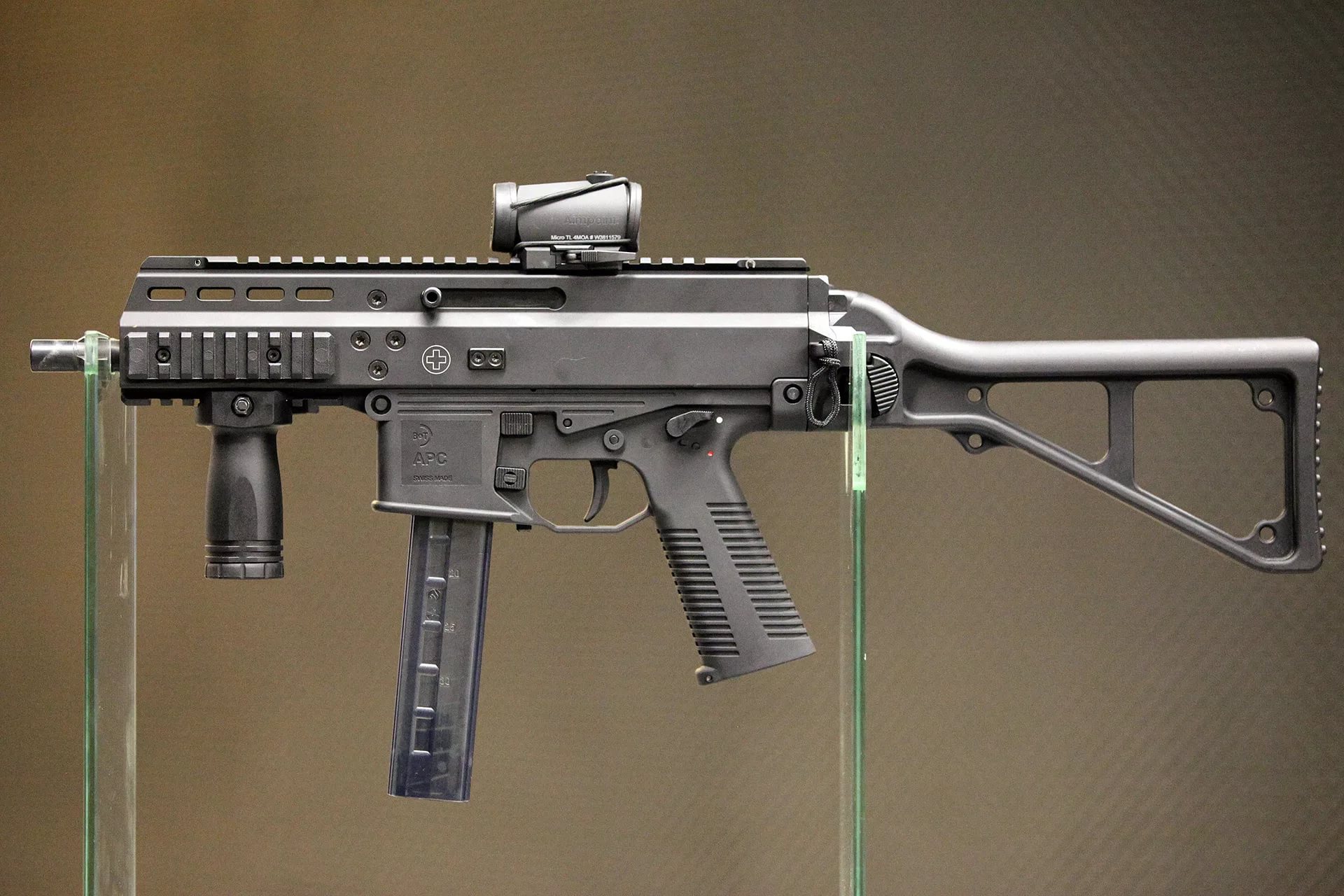 在SHOT SHOW上展示的安装消声器、伸缩式枪托的APC9 PRO半自动卡宾枪