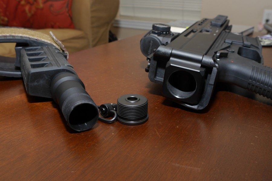 APC9冲锋枪的枪管口部加工了与MP5相同的三凸耳设计,所以MP5冲锋枪能用的消声器,它都可以用。而事实上,B&T自己就生产这种可快速拆卸的消声器。