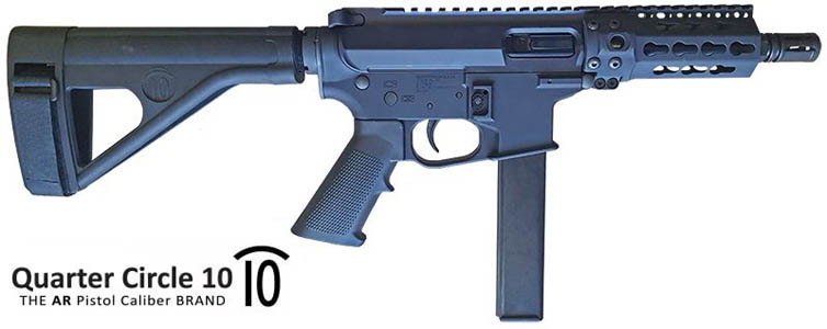 四分一圆10公司的5.5 CLT冲锋枪及其公司标志,该公司名就是Quarter Circle 10,这家在德州有上百年历史的家族企业最初是养牛起家的,他们在牛身上的烙印就是一个四分一弧度的半圆,下面有一个阿拉伯数字“10”