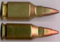 两种类似的弹药:.224BOZ弹(上)与.224VOB弹的比较,都是通过把其他现成手枪弹缩口径且配合5.56mm步枪弹的弹头得来的,而且都同病相怜地因为没有成功推出市场而被人遗忘了。
