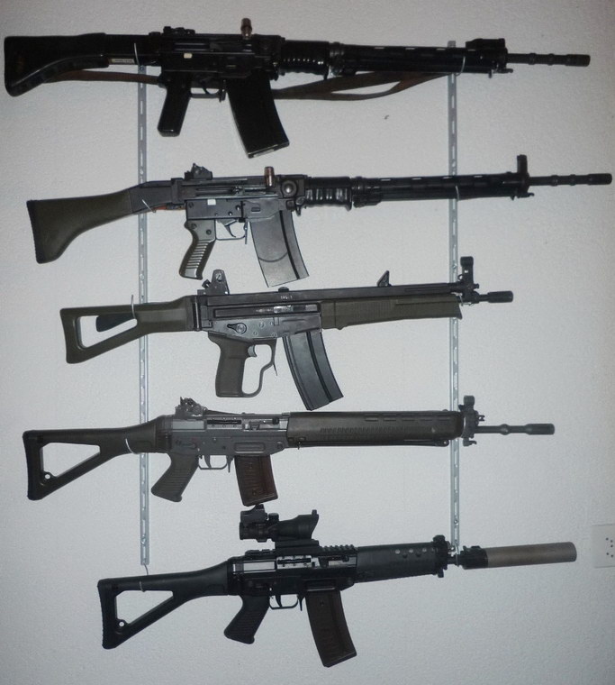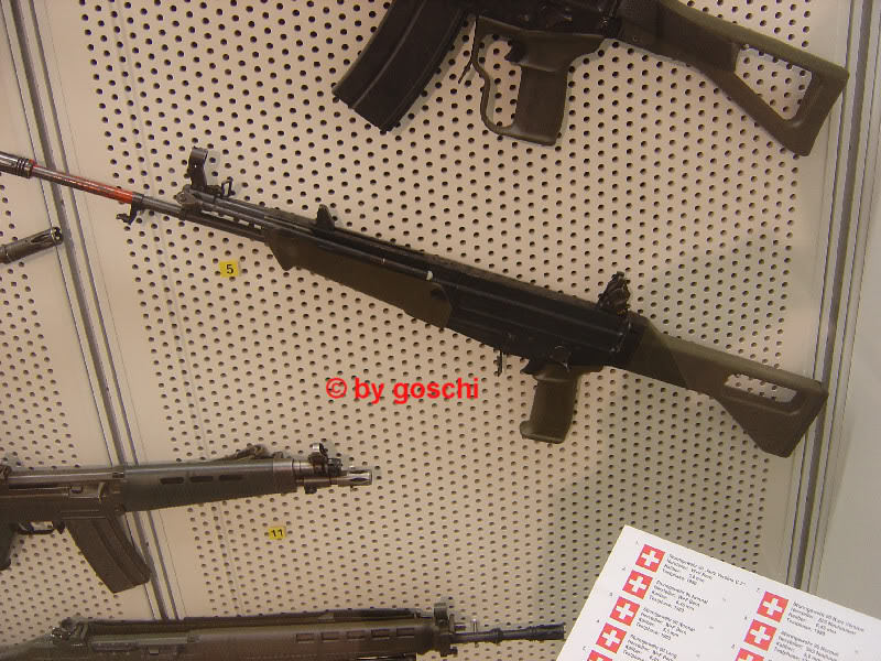 在1970年代末,瑞士开始新一代军用步枪试验,SIG公司提供了SG540和SG543共40支样枪用于试验。首次试验的目的是比较5.56×45mm口径突击步枪与7.5mm口径Stgw.57突击步枪的性能,验证小口径步枪取代Stgw57的可行性。试验结果证实了这种可行性,同时瑞士军方对新一代军用步枪提出以下要求:可用主要部件组装成不同口径的突击步枪;具有良好的射击精度;轻便且容易操作;结构简单,耐用性好,成本低;机构动作可靠;可安装与使用各种附件;提供普通士兵用的步枪型和特种部队用的卡宾枪型。瑞士陆军指定国内轻武器厂家生产两种小口径突击步枪,一种使用GP90 5.6mm弹(瑞士型5.56×45mm弹),另一种使用瑞士土恩弹药厂研制的6.45×48mm弹(5.56×45mm弹与7.5×55mm弹的中间型枪弹,其射程大于5.56mm弹)。