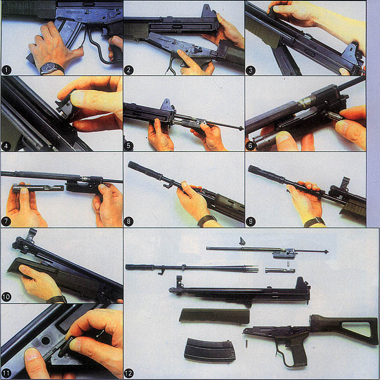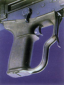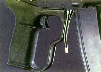 机匣的整体形状呈长方形,是用薄钢板冲压加工后与内装增强的钢块焊接成型的。发射机座用于容纳击锤、阻铁、扳机等零件,其前端采用连接轴、后端通过握把后部上端的钩,与机匣结合在一起。左右两侧都设有快慢机柄,左右手均可操作。快慢机柄转动180°,分别有保险、单发、3发点射和连发4个位置,从快慢柄的缺口处可看到这4个转换位置上的标志,但由于缺口太小,观察标志稍困难。握把由增强塑料制成,有带大型扳机护圈和不带扳机护圈两种型式的握把供选用。握把内部可储存擦拭工具。