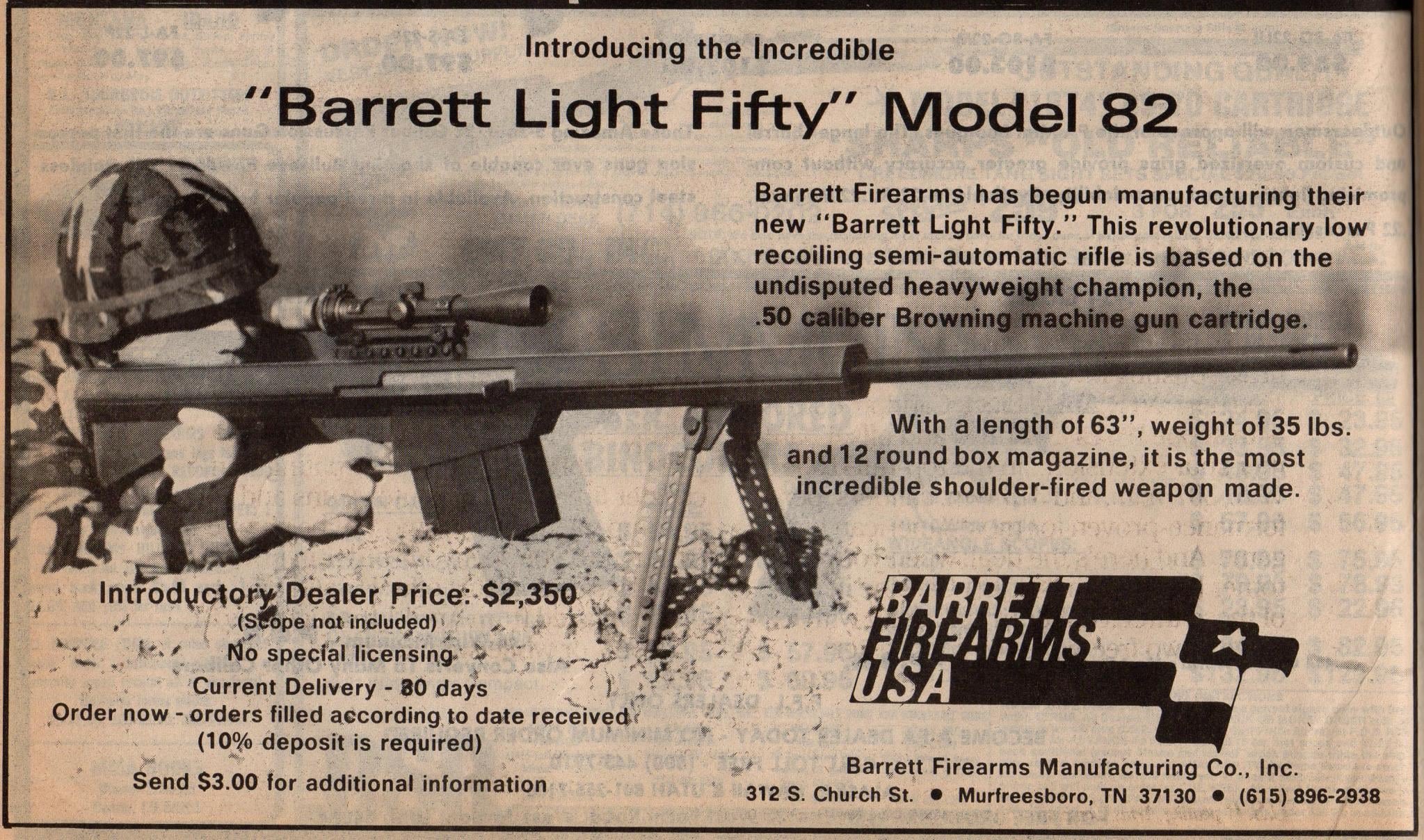 朗尼·巴雷特在1982年设计了一支半自动的.50BMG口径步枪,因此命名为M82,并开始在民用市场上销售。后来又在1986年改进出M82A1步枪。虽然精度不高,但性能可靠价格便宜,而且在.50口径半自动步枪的市场营销上也占了先机,因此巴雷特M82A1成为当今使用最广泛的大口径狙击步枪(反器材步枪)之一,几乎占领了.50狙击步枪市场的统治地位。目前至少已装备英国、法国、比利时、意大利、丹麦、芬兰、希腊、意大利、墨西哥、葡萄牙、荷兰、沙特阿拉伯、瑞典、西班牙、土耳其等30多个国家的军队或警察部队。M82A1也被广泛用作民间的.50口径射击比赛,用于1000码甚至更远距离上的射击比赛。不过这枪能用于射击比赛并不是因为它的精度高,事实上该枪精度一般只能保证在2 MOA以内,而是因为在.50步枪百花齐放前玩家可靠选择的并不多,再加上被军队采用,因此占了市场的先机和名气。