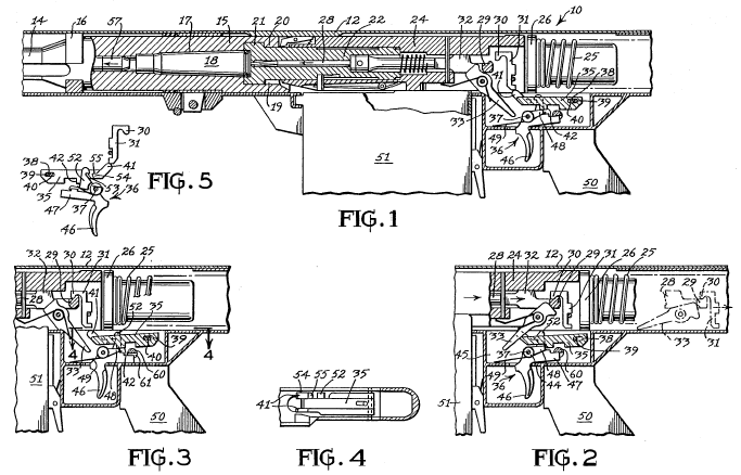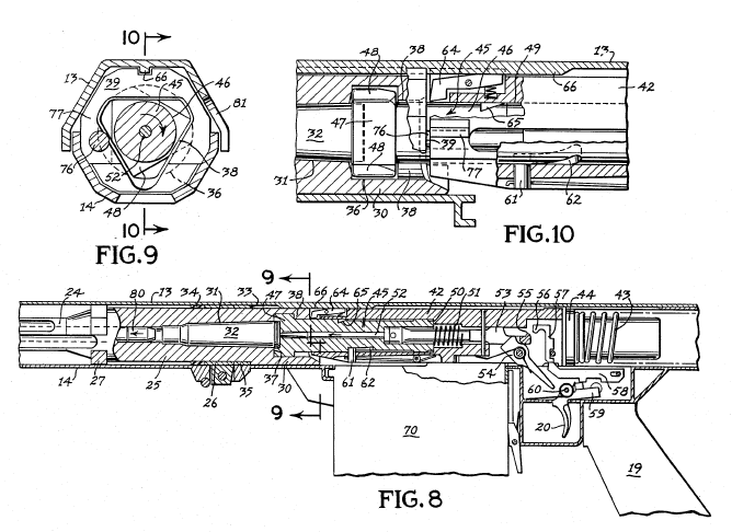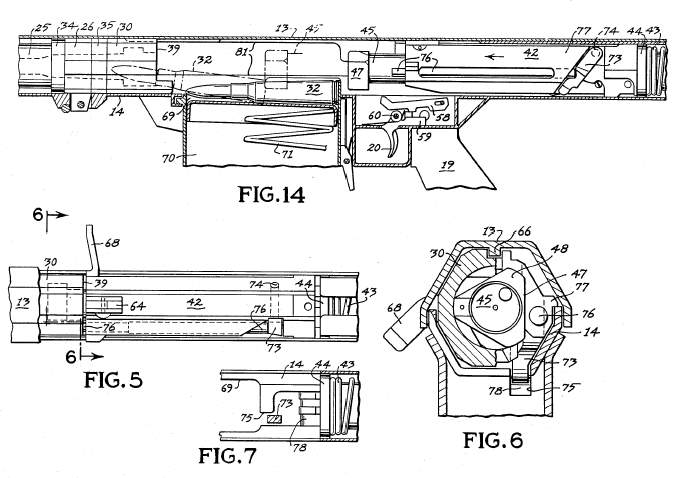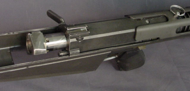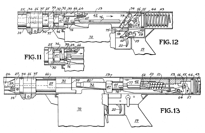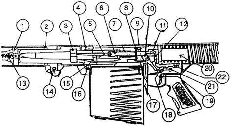 (1)枪管锁;(2)冲击缓冲器;(3)枪机;(4)枪机闭锁;(5)击针;(6)击针延长段;(7)枪机复进簧;(8)止动销;(9)加速器;(10)待击杆;(11)阻铁簧;(12)阻铁;(13)枪管复进簧;(14)机匣连接销;(15)连接销;(16)弹匣前卡口;(17)弹匣卡笋;(18)解脱子;(19)扳机;(20)缓冲器;(21)保险;(22)扳机连杆