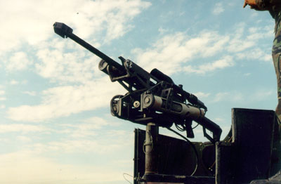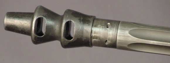 早期的M82A1的枪口制退器是圆柱形的,后来改为右侧图中的V形制退器。这种V形制退器减少了69%的后坐力。 |