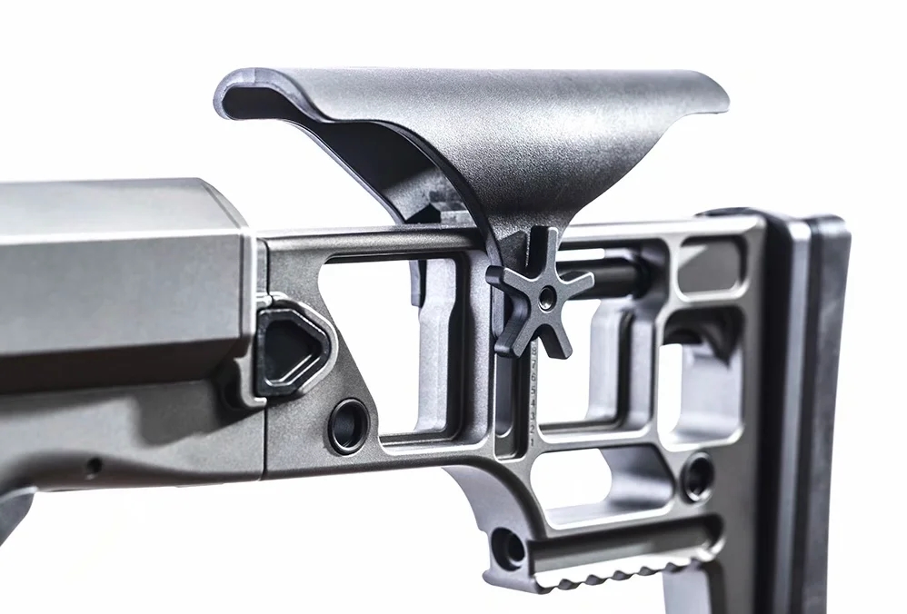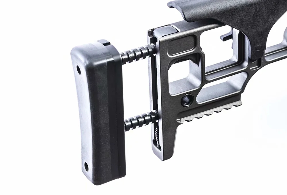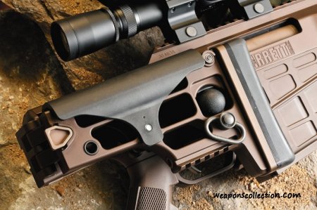 除了容易更换枪管外,MRAD的另一个重大改变是铝合金制的折叠式枪托,枪托向右折叠时,枪托中间的镂空会抱住拉机柄,防止误操作和减少钩挂。当枪托折叠后,全枪长能缩短到108cm(20英寸枪管),这样比一支M16A2也就长一点。另外枪托的托底板可调节枪托长度,贴腮板也可调节高低,这些细节是继承98 Bravo的。