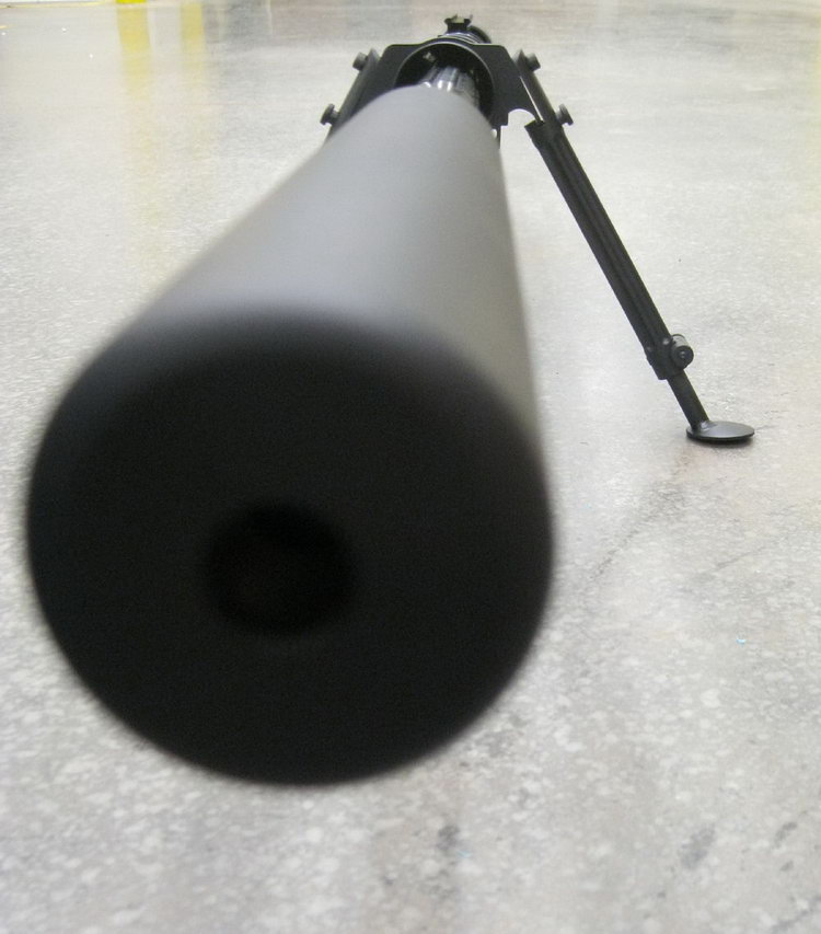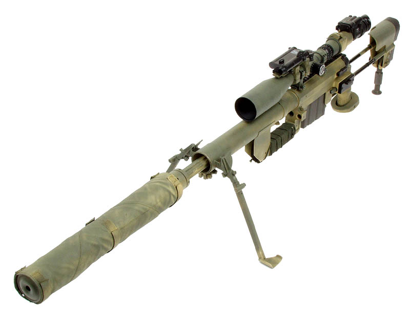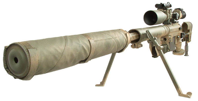 干预M200的枪口制退器可换成OPS INC公司生产消声器,该消声器由不锈钢制成,寿命比步枪枪管本身的寿命还长(我怀疑枪管的精度寿命短是由于实芯弹头的比起传统的铅芯弹头“硬”,导致膛线磨损较快)。如果消声器里充满水,可在6秒内排出,因此射手如果携带潜水,出水后可以迅速进入射击状态。