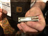 ![]() 装填块式弹药的剖面,可以看出一个瓶形内腔作为发射药室,前面嵌弹头,后面的小孔是底火 |
