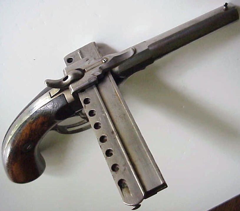![]() 早期的口琴枪是多管形手枪,枪管与弹膛是一体 |