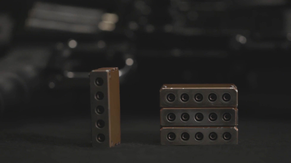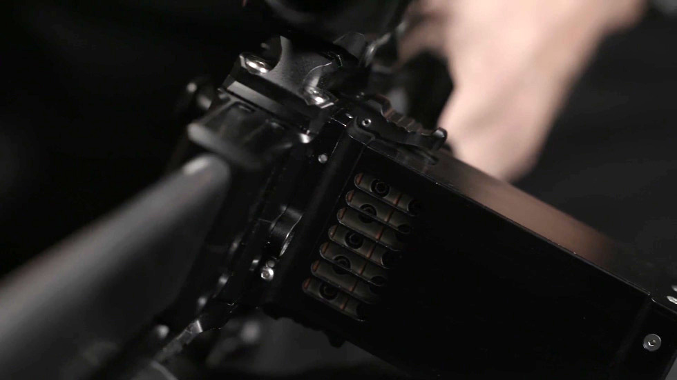 另外,口琴枪的弹膛是横排插入的,而FDM L5的装填块则是竖向放置的,射手把数个装填块堆叠在一起,通过枪身右侧巨大的装填口(兼抛壳口)压入,推进枪身左侧一个巨大的弹药盒中,处于最外面的一排装填块就对准了枪管处于待击位置。当这一整排装填块的弹药在各枪管中都依次发射后,就会自动抛出这一块装填块,然后下一块装填块就会被顶到待击位置,并不需要射手手动参与。而口琴枪则需要射手用手推移弹膛来逐发发射。而且从这个结构来看,有可能射手可以随时装填,也就是说,原本装在枪上的那一堆装填没有打光之前,射手随时可以利用战斗间隙再压几个装填块进去,这样就可以保持枪支处于“全满”状态(目前官方公布的信息太少,此为我的推测)。