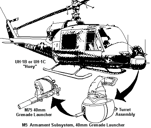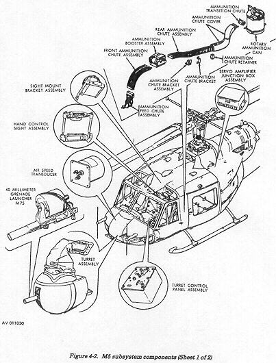 M5型武装系统在1958年至1975年间使用,是一种安装在机鼻位置上的球形炮塔吊舱,最初安装的M75榴弹发射器,后来改为M129榴弹发射器。M5武器系统可安装在UH-1B、UH-1C、UH-1M“休伊”系列直升机上,同时也用于ACH-47A“Guns-A-Go-Go” 。M5系列使用盒形弹箱时携弹量为150发,使用鼓形弹箱时携带量为300发,后者把弹链装在一个302发容量的带输弹器的滚筒弹箱中,通过一个输弹槽送到榴弹发射器内。带反射型瞄具的操纵手柄安装在副驾驶座位上,控制安装手以上的副驾驶的座位上。