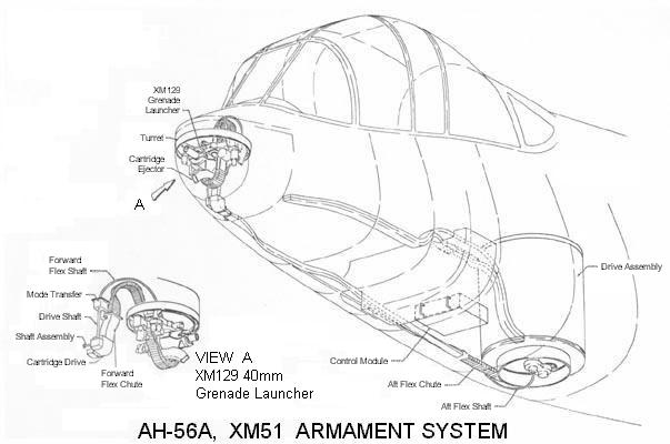 XM51武装系统在1966年至1972年间研制,是用于洛克希德AH-56A“夏延人”高速武装直升机的直射武器系统,包括一个安装在机鼻下方的XM129榴弹发射器(也可以换成XM196机枪),及备弹780发的电动鼓形弹箱,可通过XM110头盔瞄具进行瞄准和转向,或XM112射手控制装置和XM114反射瞄具进行控制。