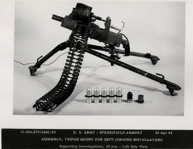 当时M79所用的40mm低速榴弹已经在使用,但由于M75用于航空器,需要高速的榴弹以提高射程,以便从空中有效地打击地面目标。所以M75的关键是弹药部分,为此专门研制了40×53mm SR口径的高速榴弹,枪口初速是790fps。这种弹药有两种型号,一种是M384高爆榴弹,另一种是M385练习弹。试射时在2045码能准确命中目标。保险距离为离开枪口的60~120英尺。