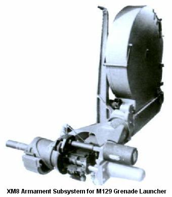 XM8是在1967年至1972年间试验和使用的一种轻型直升机遥控榴弹发射器系统,用于安装在OH-6A或后来的OH-58轻型观察直升机的左侧,和XM27(M134机枪)武器系统相似。XM8系列最初是安装M75自动榴弹发射器,后来改为安装XM129。一个XM8系统携带150发,可作俯仰调整,由副驾驶控制瞄准和射击。