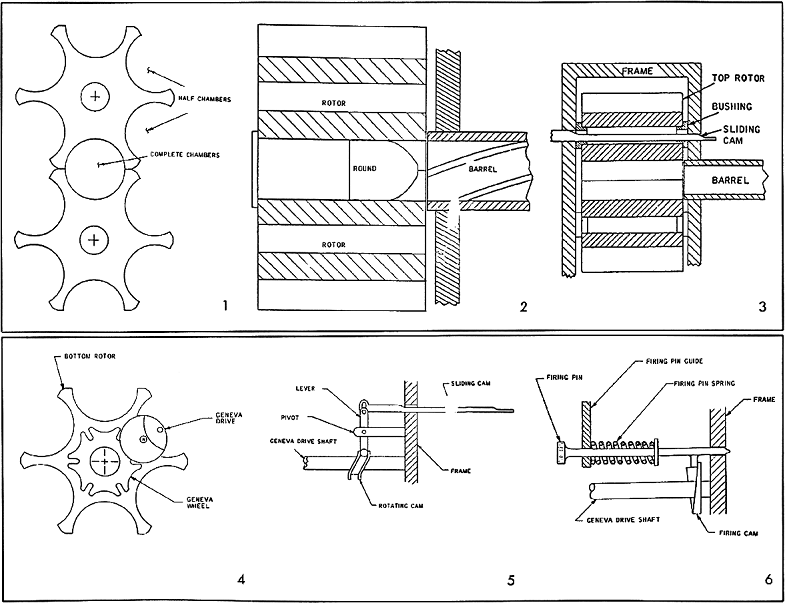Mk18内的星形棘轮布置,两个棘轮逆向转动时把弹链拉扯进去,两个棘轮“抱住”待发的榴弹并起到弹膛的作用