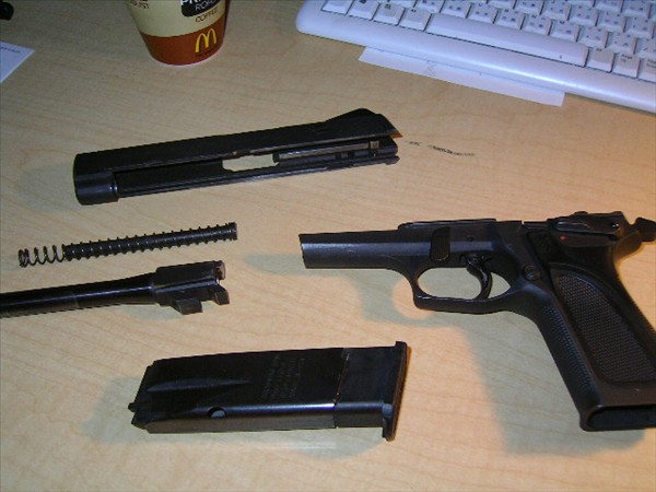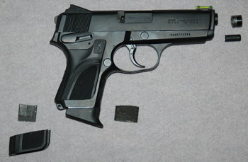 BDM手枪采用轻型合金钢生产,重量较轻。握把是单件式的聚合物,枪管长4.73英寸,三点式机械瞄具类似S&W半自动手枪的Novak战斗瞄具,照门外侧有护耳。弹匣插入口有倾斜角,便于快速装填。与同时代的手枪不同的是,在BDM的握把底部有一个绳环。