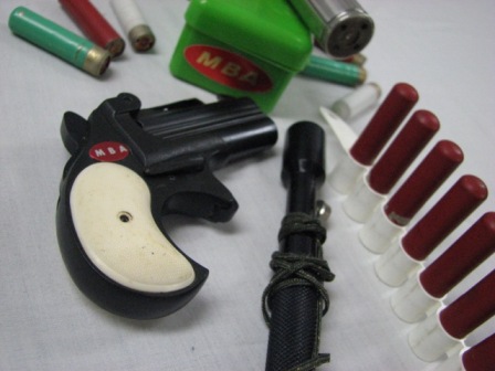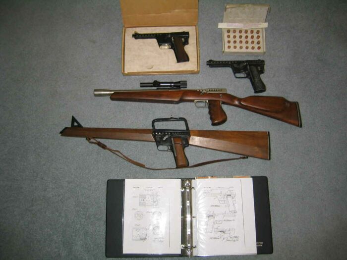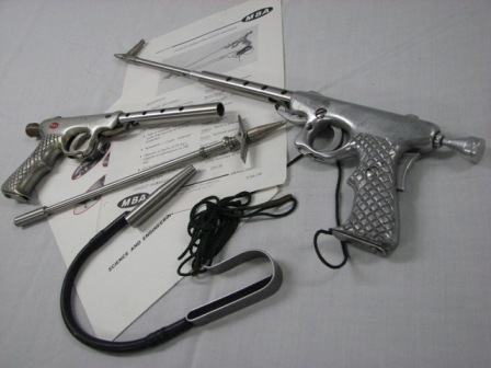 Gyrojet火箭枪也发展过一些别的形式,例如左边是火箭枪原理的水下手枪,发射一根短矛,右边是德林杰手枪式的火箭枪,都是12mm口径