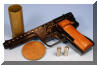 Gyrojet手枪与是M1911手枪的大小相同,但是,它很轻,仅重625克,由铝合金制成的枪身上布满许多通孔,让你拿在手上看在眼里觉得这可能是一件玩具,无法承受正常枪支射击时的压力。幸好Gyrojet不是传统意义的枪支。