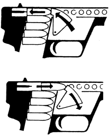 火箭弹向前运动的同时,压下供弹杆,使供弹杆回到待击位置 |