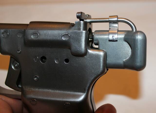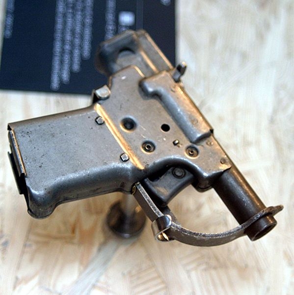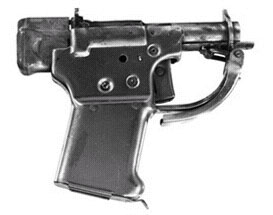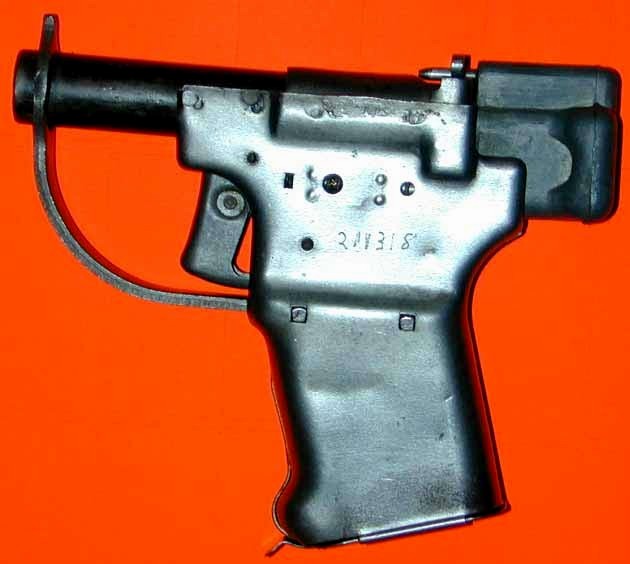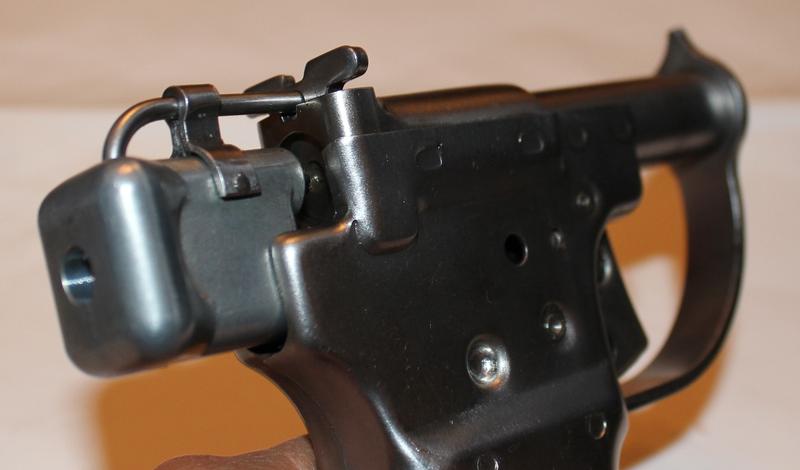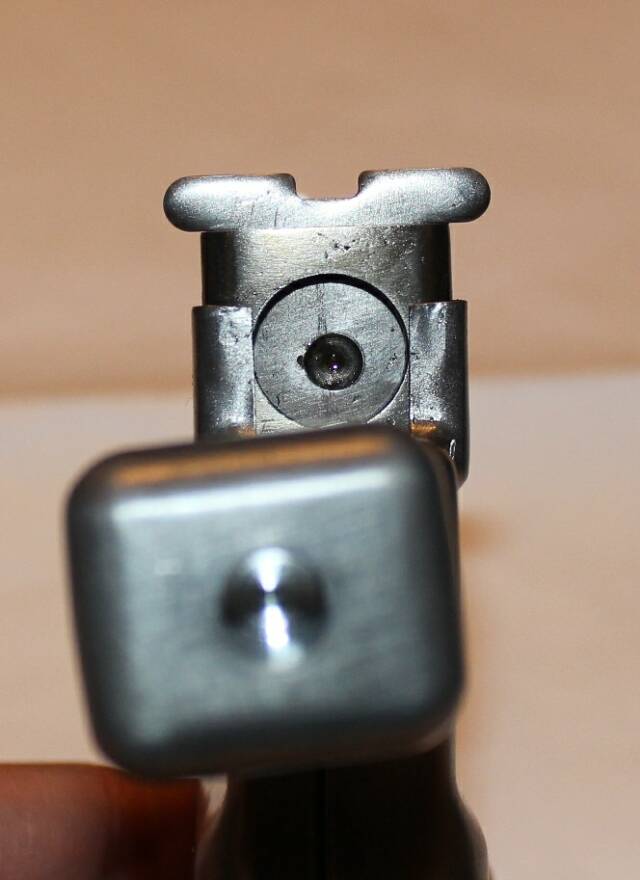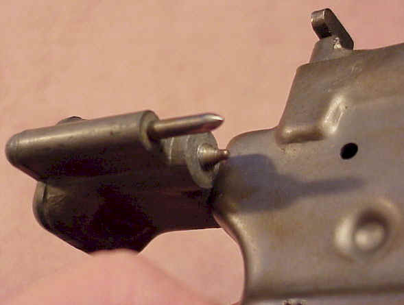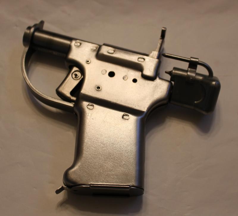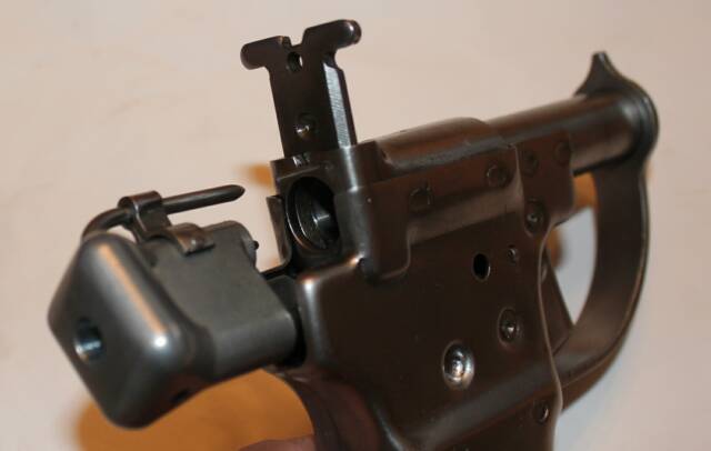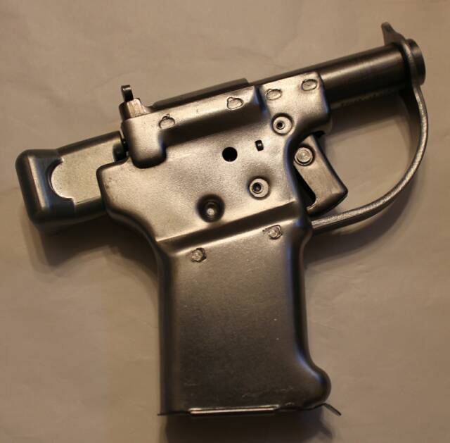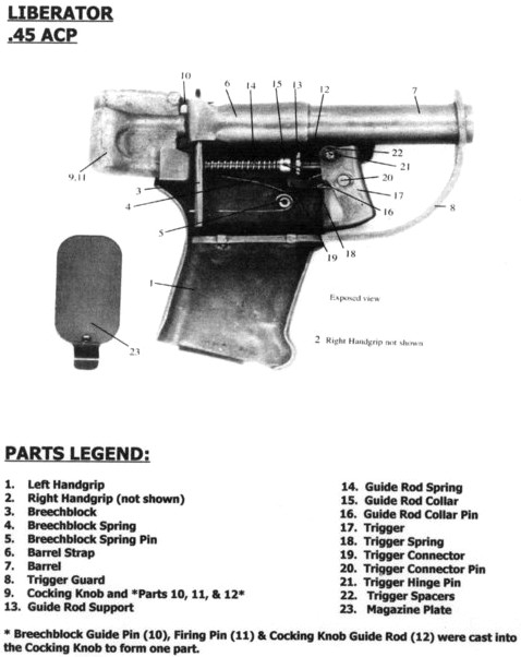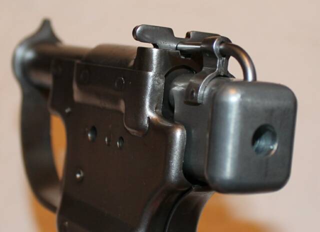 解放者第2型,增加了一根定位销,插进闭膛用的铁板上增加的小孔内,可防止击发机块旋转时位置不正确,使击针没有对正底火