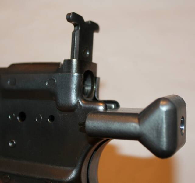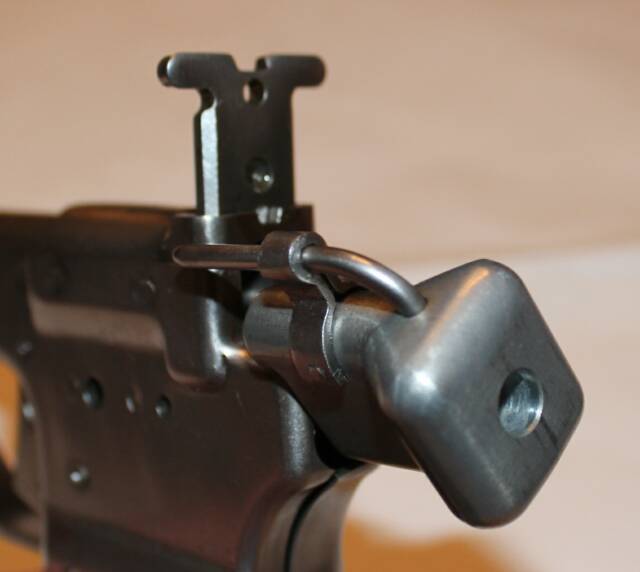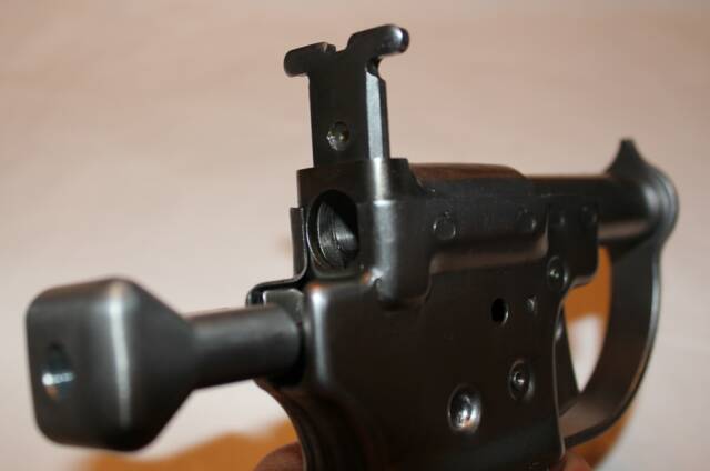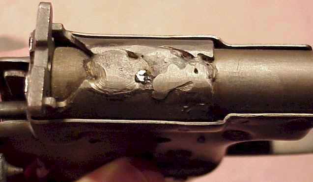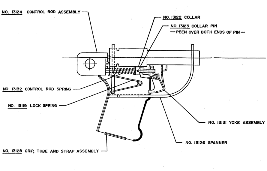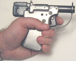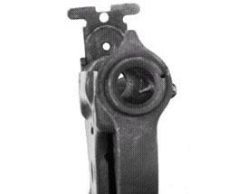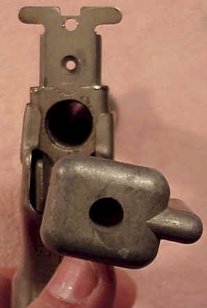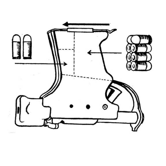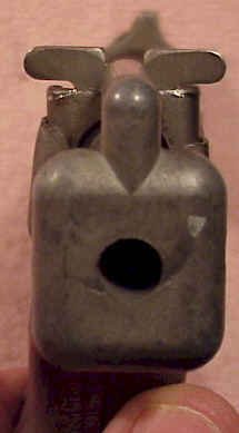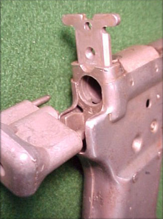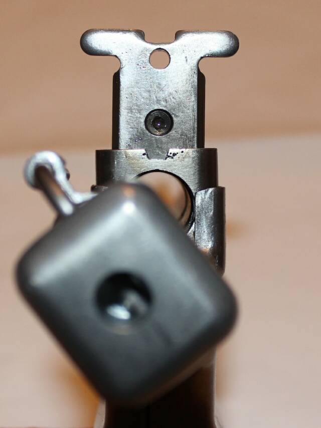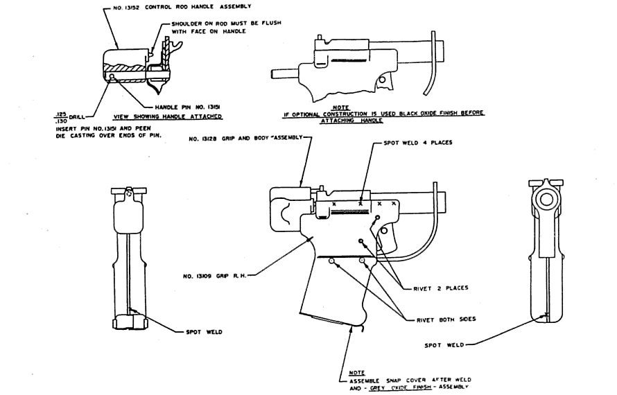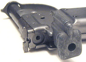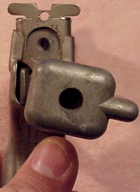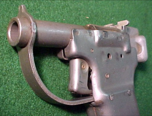 解放者第2型,增加了一根定位销,插进闭膛用的铁板上增加的小孔内,可防止击发机块旋转时位置不正确,使击针没有对正底火