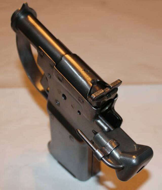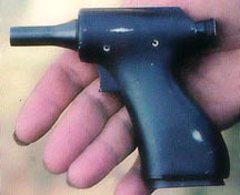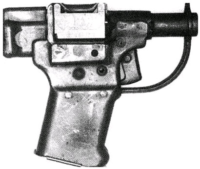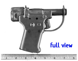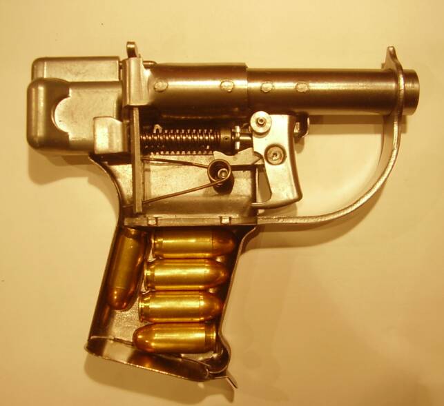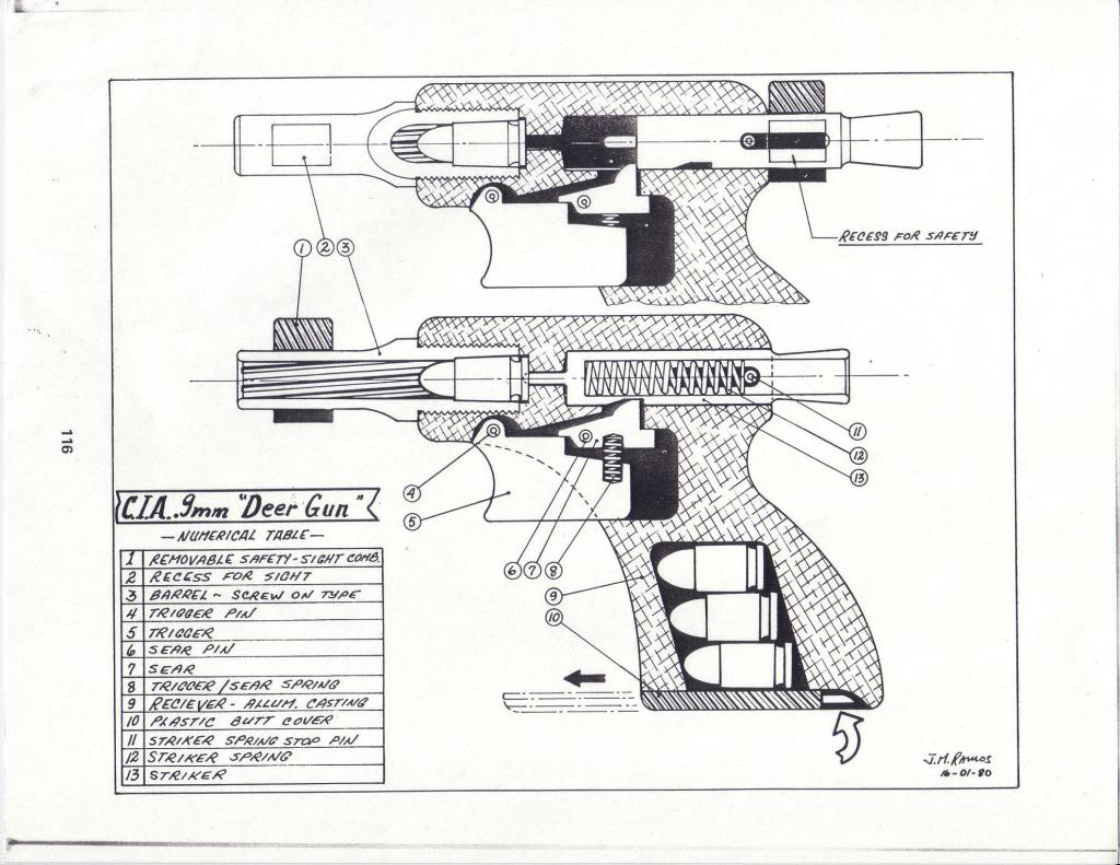 二战结束后,大批“解放者”手枪被美国回收和销毁,现在许多收藏家想要找一把“解放者”手枪也相当不容易。而这个愚蠢行为导致的后果是——当CIA想要在越南使用类似的东西时,他们不得不重新设计和制造,并命名为“鹿枪”(Deer Gun,有时被称为Dear Gun)。然而他们并没有学到前辈们的经验教训,大量的“鹿枪”也在越战后被销毁,结果“鹿枪”比“解放者”更罕见。右图是打开后膛的“鹿枪”,下图是关闭后膛,是CIA在1960年代初期研制的,其外形比“解放者”更奇怪,就像个缩小的电吹风。