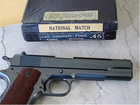 在1919年,就已经有人在国家比赛上使用M1911手枪,但可以想像,这些手枪与市面上卖的是一样的。在1932年的国家比赛上,柯尔特第一次提供国家比赛级的1911式靶枪(另一些资料是说1933年)。NM型的M1911手枪与军用型M1911的区别在于它们采用了比赛级枪管、网格型防滑纹的板机、网格形防滑纹的弓形握把背板、胡桃木握把侧片、和手工打磨的内部零件,并作烤蓝处理。在后来的型号上还包括斜坡式准星和可调式照门。这些型号在套筒左侧都打上了“国家比赛.45口径柯尔特自动手枪”(NATIONAL MATCH COLT Automatic Calibre .45)的标记,到1941年,由于第二次世界大战需要全力生产军品,NM型被迫暂时停产。