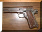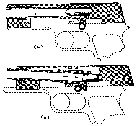 1911式手枪的自动方式为枪管短后坐式,闭锁方式为枪管偏移式(枪管绕绞链上下摆动),也称为枪管摆动式或枪管起落式。枪弹发射后在火药气体压力作用下(或手动上膛时用手拉动套筒),套筒和枪管一起后坐,由于绞链的下端固定在套筒座上,因此其上端向后转动,越过死点(起延迟开锁作用)后便逐渐拉枪管尾端向下摆而开锁。当套筒复进推弹入膛时,推动枪管复进到位,因为枪管后下端与套筒座为绞链连接,所以枪管向前运动时,使绞链向前回转,顶起枪管尾端,使枪管后上方的两条闭锁凸筋正好进入套筒内壁相应的闭锁槽中。
