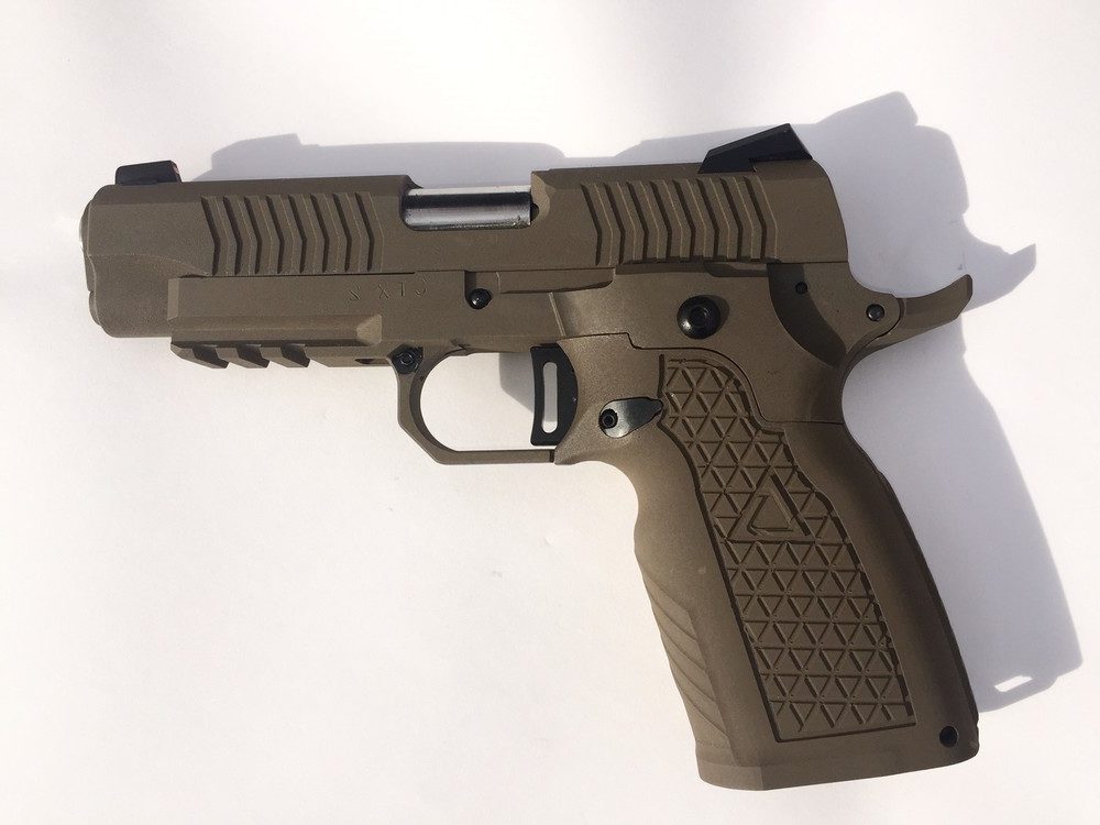 第二年这两家公司又在MTX基础上,利用了模块化的击发机构特点,把回转式击锤改成平移式击针,推出了STX手枪(有点类似于SIG的P250变成P320)。而STI-Detonics STX手枪作为一把模块化的平多式击针1911,是为了参加美国陆军的MHS计划——显然这两家公司的人读懂了MHS的潜在要求,所以才作出更改击发机构的决定,而且因为MHS需要的是一把9mm手枪,所以STX也改成9mm口径。不过不知道是什么原因,STX后来又主动退出了竞争。也许是因为价格上没有优势,因为当时一把MTX手枪的零售价就要卖1,500美元,作为参考,比其他竞争对手都要贵得多。那么STX也便宜不到哪里去。另一方面可能是因为STI的产能太小,根本不可能满足MHS的供货要求。所以这两家公司可能只是打算借MHS来为自己的新产品做宣传,达到效果就主动退出了。按照MHS的要求,最初研制的STX手枪外表完全处理成沙色造型,不过在退出MHS计划后,这两家公司就在民用市场上推出黑色的STX手枪。