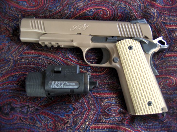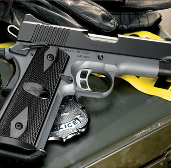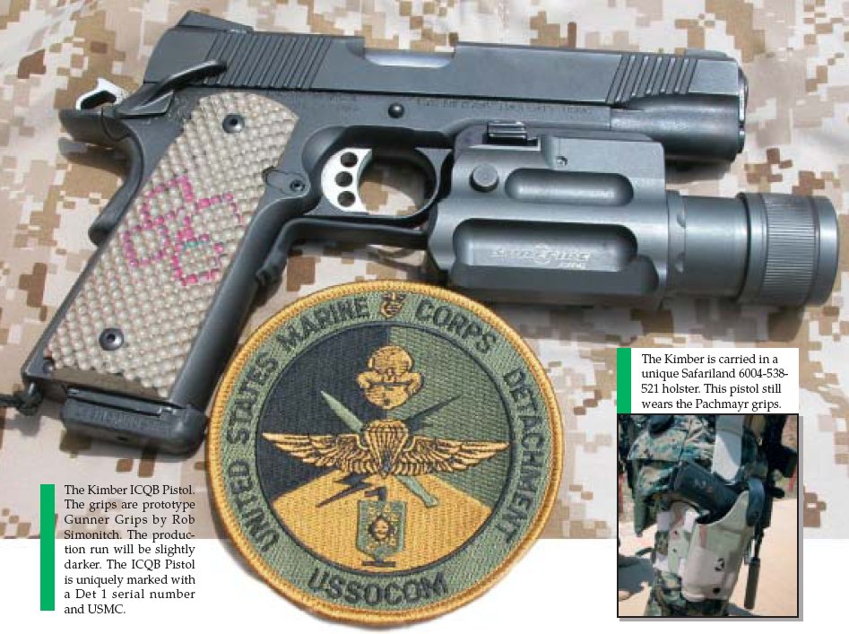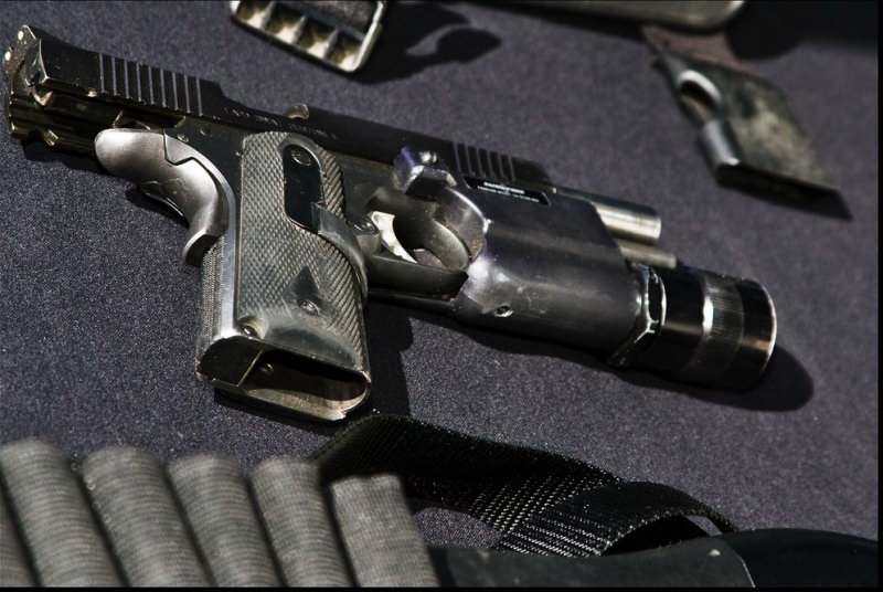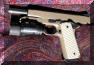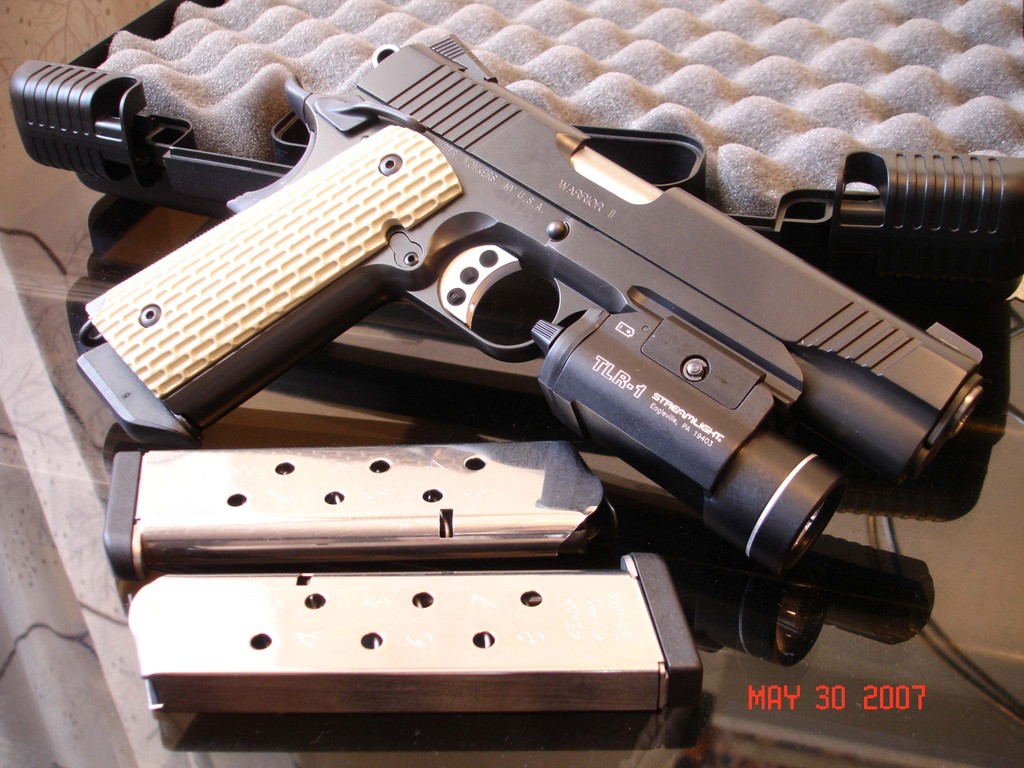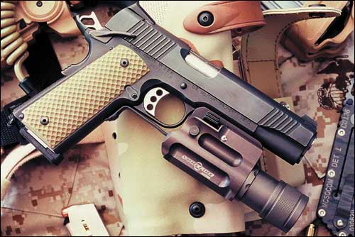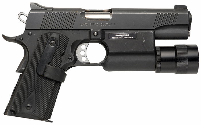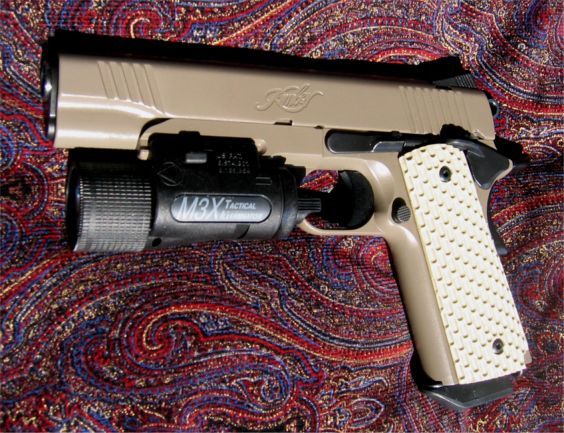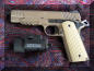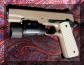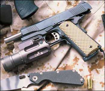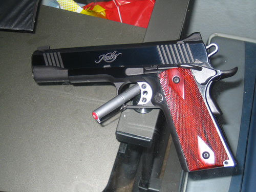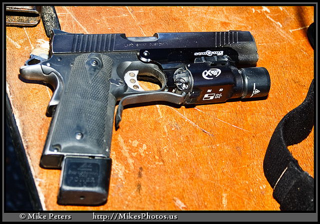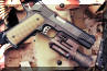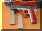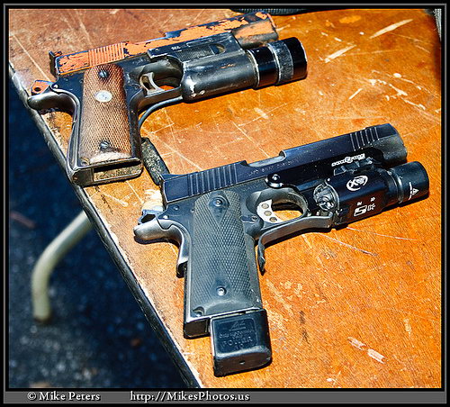 LAPD SWAT在2009年开放日上展出的1911手枪,橙色握把片的是COLT旧枪,黑色的就是KIMBER TLE II