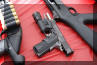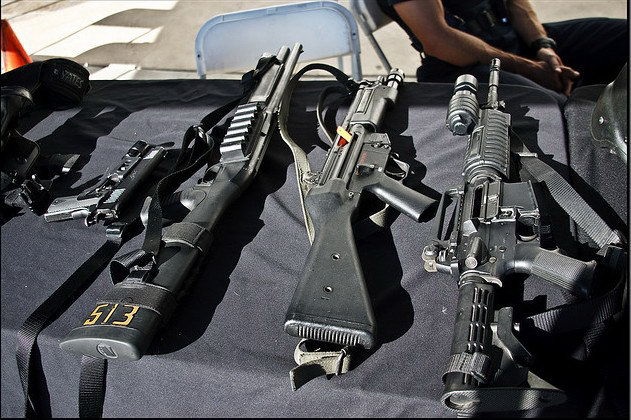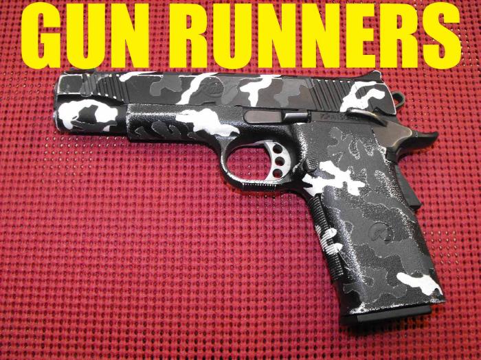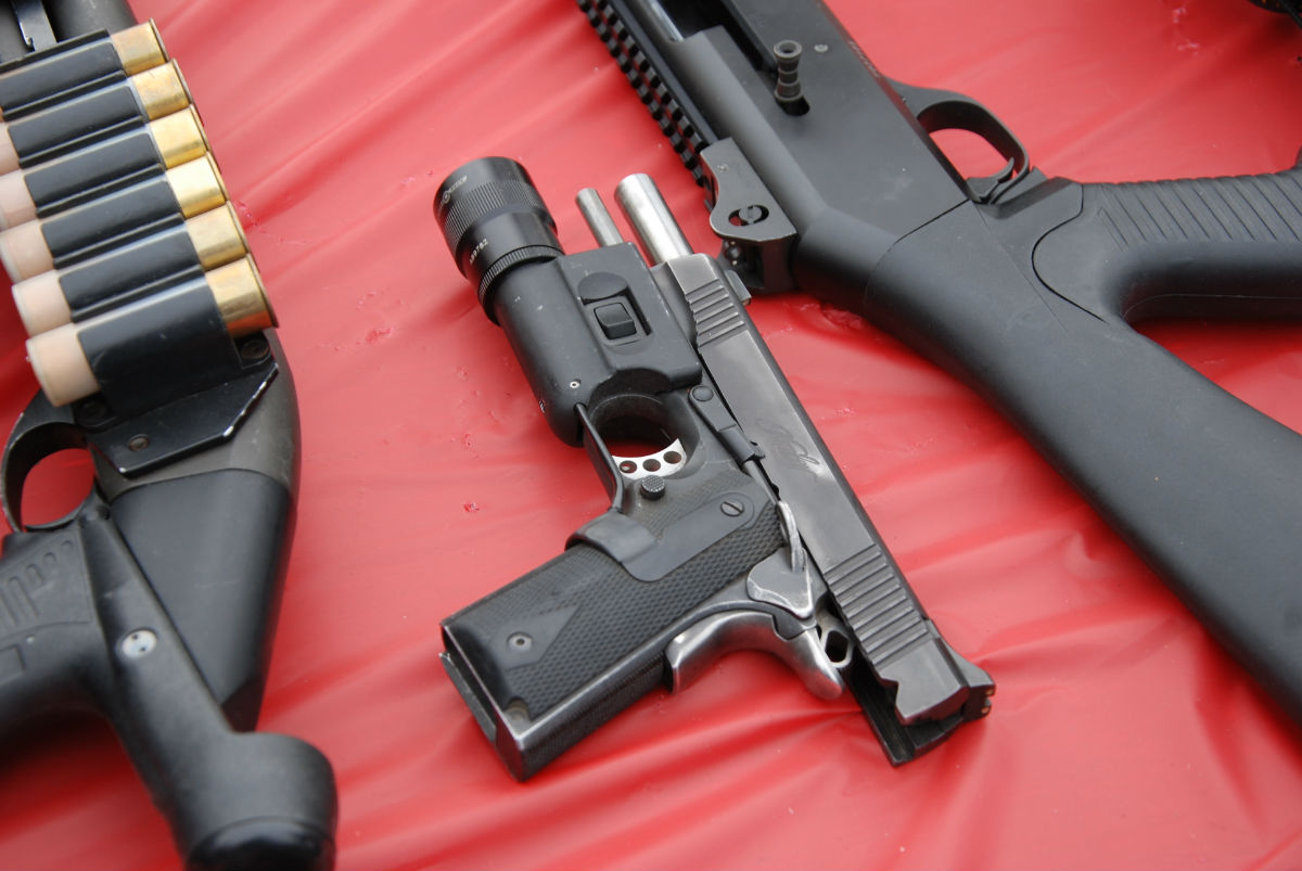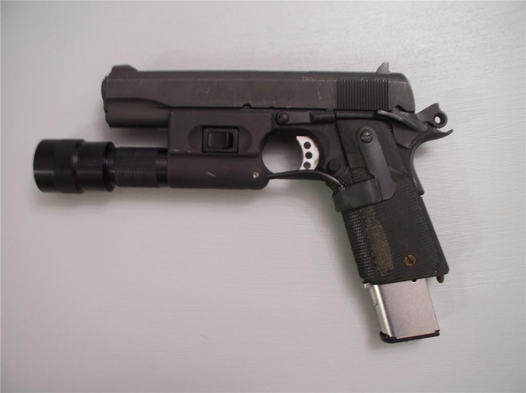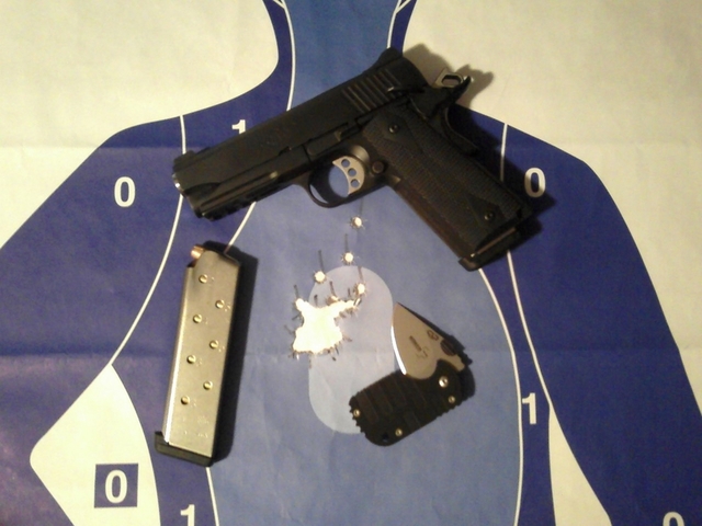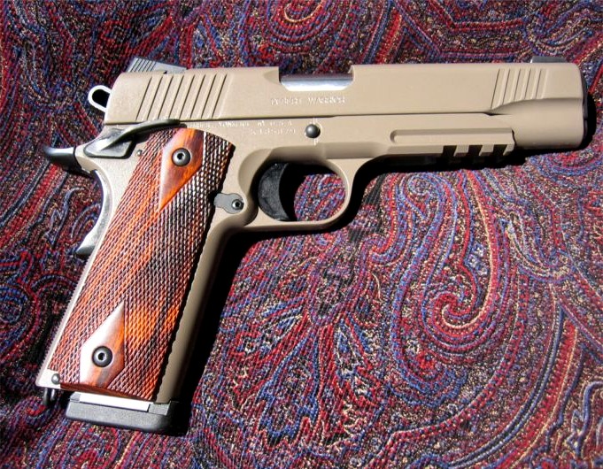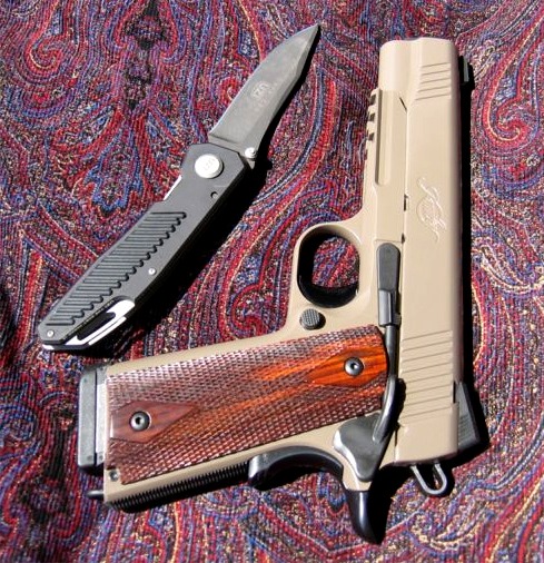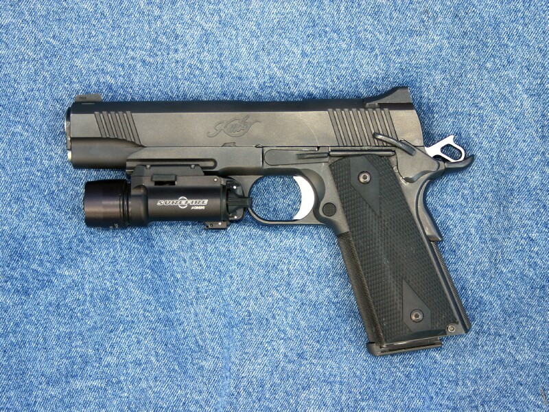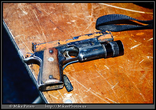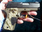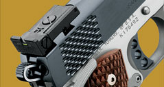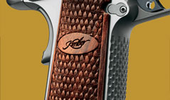 LAPD SWAT在2009年开放日上展出的1911手枪,橙色握把片的是COLT旧枪,黑色的就是KIMBER TLE II