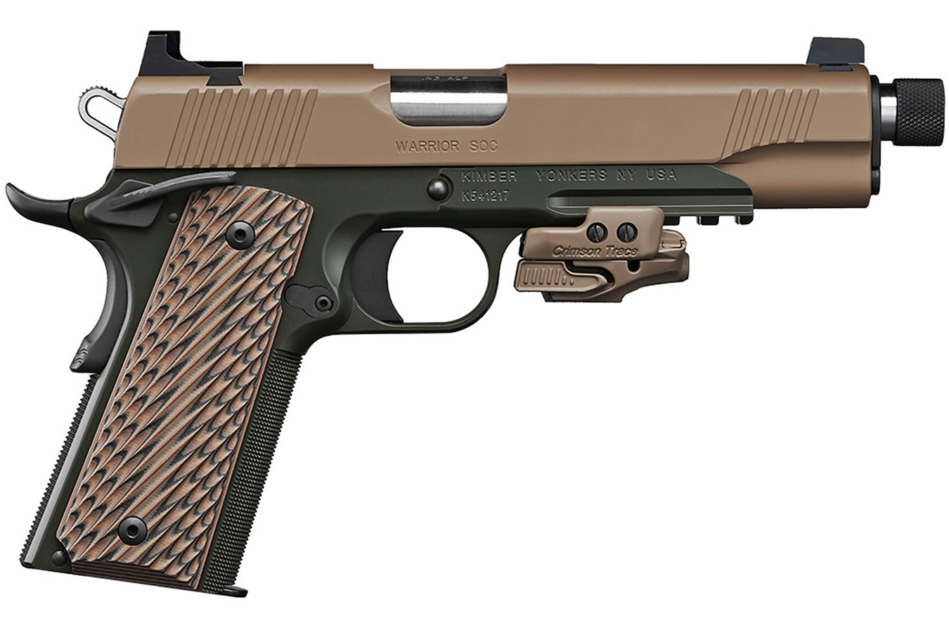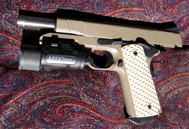 Kimber Warrior SOC 45,延长的枪口外表有消声器接口螺纹,不安装消声器时会旋上一个枪口帽来保护螺纹