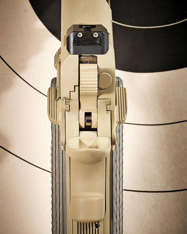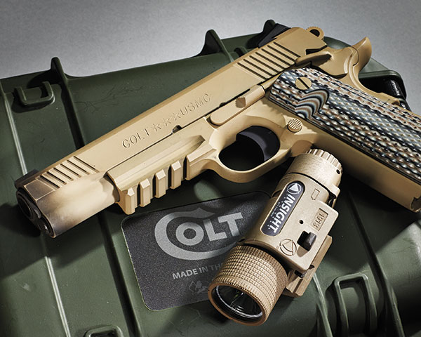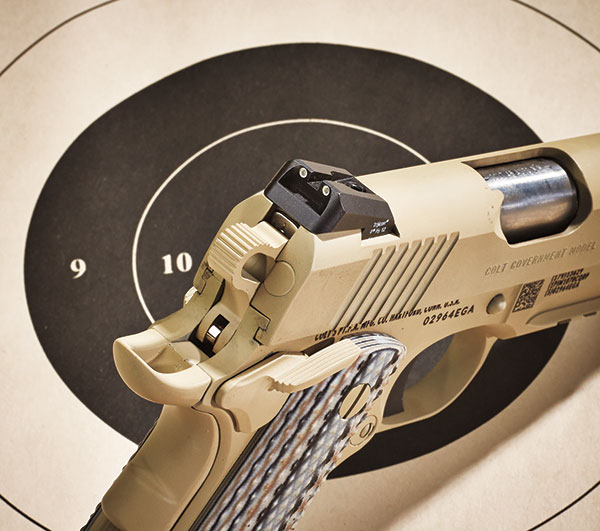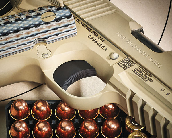 M45A1手枪是在柯尔特商业型1911手枪中的XSE系列里的政府型手枪为基础改进而成,“海狸尾”式握把保险、两侧手动保险柄、套筒前端也有倾斜式的防滑纹等设计都是来自XSE手枪的。而M45A1主要的改变是在底把前端增加了皮卡汀尼导轨以方便安装各种战术灯、激光指示器等附件,另外手枪外表处理成时下流行的沙色造型。标配的弹匣为8发,由于弹簧材料技术的更新,现在1911式手枪新的8发单排弹匣的长度并不比原有的7发弹匣长多少,不过旧的7发弹匣也是通用的(个别士兵会采购10发弹匣使用)。