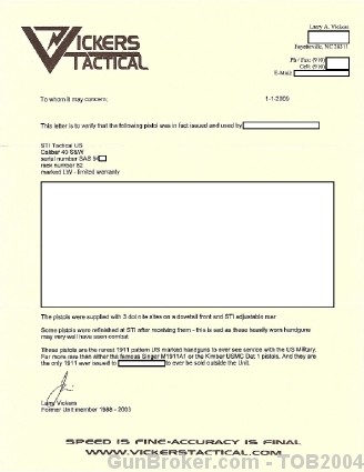 在二手枪网站gunbroker上卖的两把连号的.40口径STI 1911,隐晦地说是三角洲部队用过的,并附有退役三角洲队员Larry Vickers的亲笔签名信证明其真实性