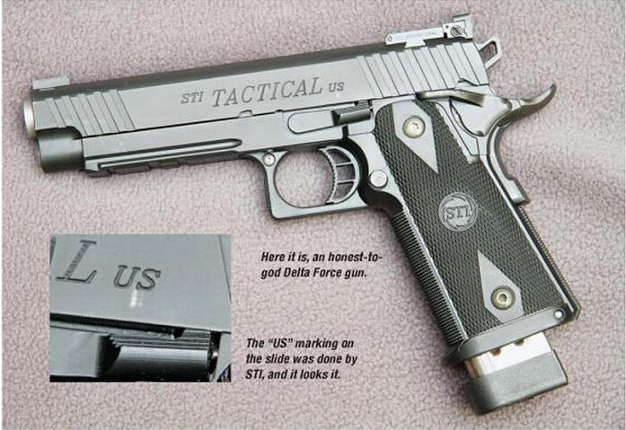 其实,三角洲部队是陆军中少有的坚持用1911的单位,不过多数是由单位里的军械师用比赛级部件组装的,而这些部件的来源之一就是STI公司(主要是枪身部分),当然这些用STI部件及其他公司的枪管、扳机等比赛级部件改装出来的1911虽然很准,但至少不会像STI自产的Racegun那样扳机敏感。但三角洲队员们后来发现这些精密的比赛级1911无法抵抗伊拉克的风沙侵蚀,虽然三角洲用了1911有20年,但在“沙漠风暴”时期三角洲的主要工作是寻找飞毛腿,没多少机会近战。