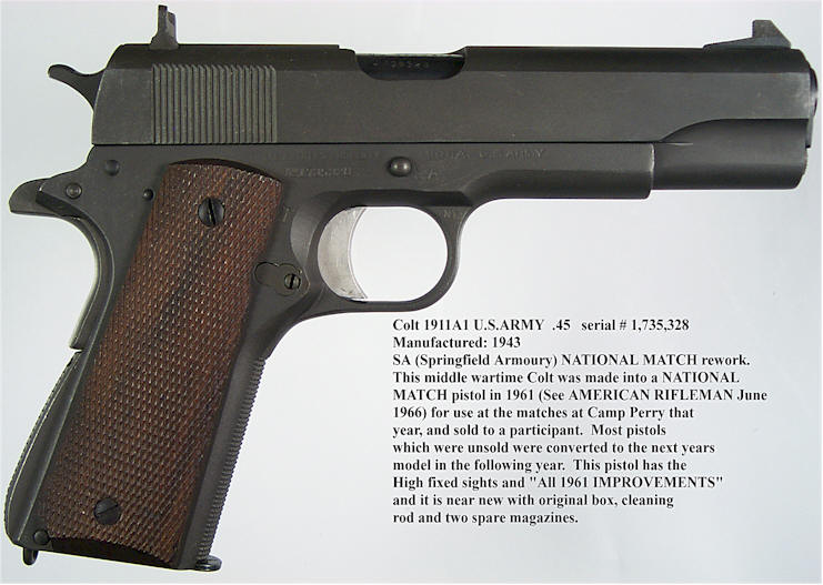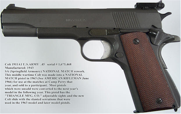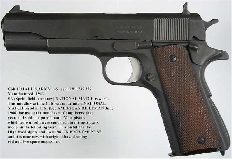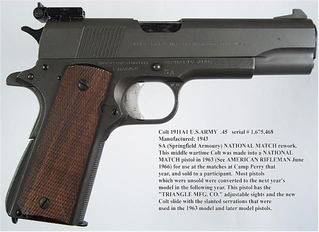 从1955年开始,每一年春田兵工厂都用现役的M1911A1手枪改造一批NM型手枪,直到1964年兵工厂关闭。这些NM型手枪被称为“改装式政府型国家比赛型”(Government National Match Reworks),枪上的部件有“NM”标记的部件并作磷酸盐防锈处理,大部分还增加有春田兵工厂的标记“S.A.”。