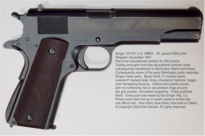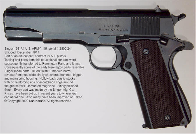 在1925年,美国陆军军械部要求胜家缝纫机公司(Singer)进行有关大批量生产M1911A1手枪的可行性研究,该研究花了一年时间,在现有生产设备和工艺上进行调查,当时估计生产能力可达到每月25,000把,但这只是一次纸上作业,并没有实际投产。到了1939年, 胜家公司再次被要求开展研究大幅提高M1911A1手枪生产速度的可行性,并在1940年4月17日获得一份500把M1911A1手枪的生产合同。该项目的研究目的是通过培训工人和调整机器,使产能提高到每小时100把手枪。